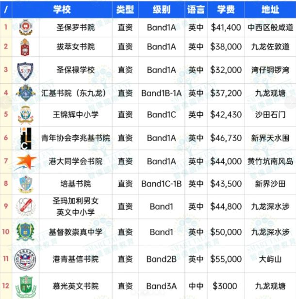 油尖旺区,女校,学费38,000–40,000,近80%港大录取率,音乐与体育强项,提供寄宿。