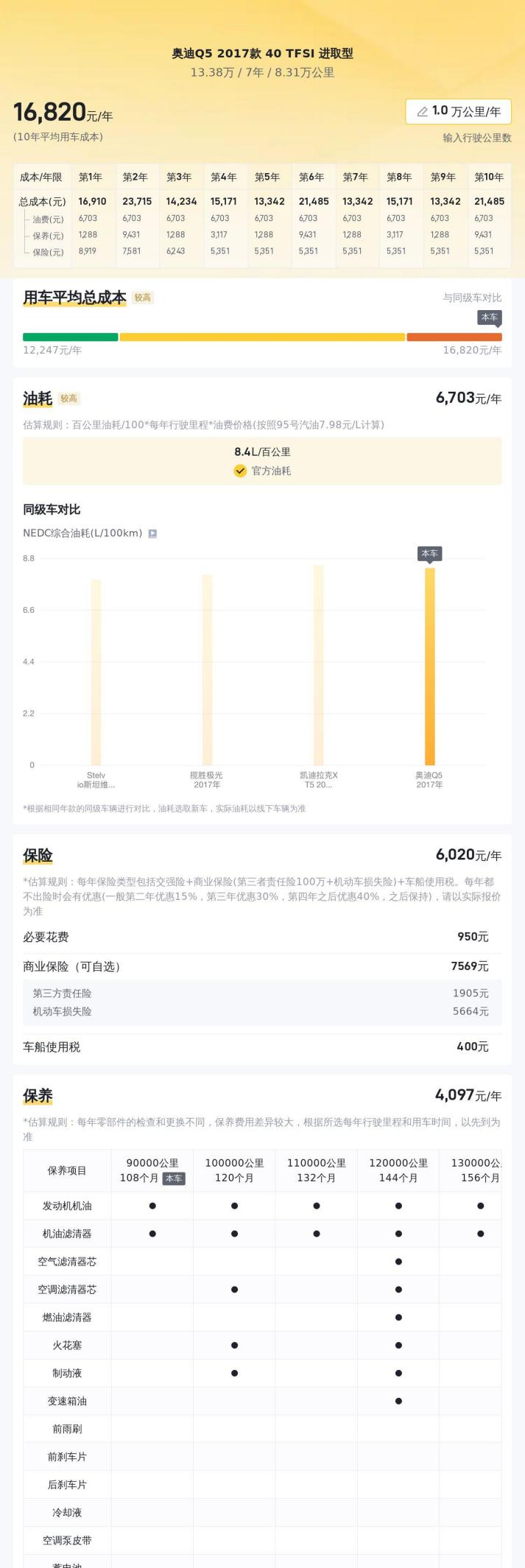 用车成本方面,根据官方数据,这辆Q5的百公里油耗为8.4L。按照每年行驶2万公里计算,以95号汽油8元/L的价格计算,每年的油费大约在13440元左右。保险费用方面,预估每年在6755元左右,包括交强险、商业险以及车船使用税。保养费用方面,每年大约在4100元左右。总的来说,每年的用车成本大约在24295元左右,平均每月约2025元。这对于一辆豪华品牌SUV来说,属于正常范围,但对于普通家庭来说,也算是一笔不小的开支。