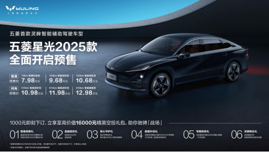 目前,五菱星光2025款已正式开启预售,新车共推出6款车型。插混车型:70km智能标准型预售价7.98万元,150km智能进阶型预售价9.68万元,150km智能领航型10.68万元;纯电车型:510km智能进阶型预售价10.98万元,610km智能进阶型预售价11.98万元,610km智能旗舰型预售价12.98万元。凡通过五菱汽车APP、抖音等官方平台以1000元下订,即可解锁至高价值16000元的“精英空投礼包”,包含置换补贴、金融贴息、三电终身质保等好礼。此次预售政策不仅展现出五菱在产品诚意上的满格输出,也再次印证了其“科技普惠”的决心。