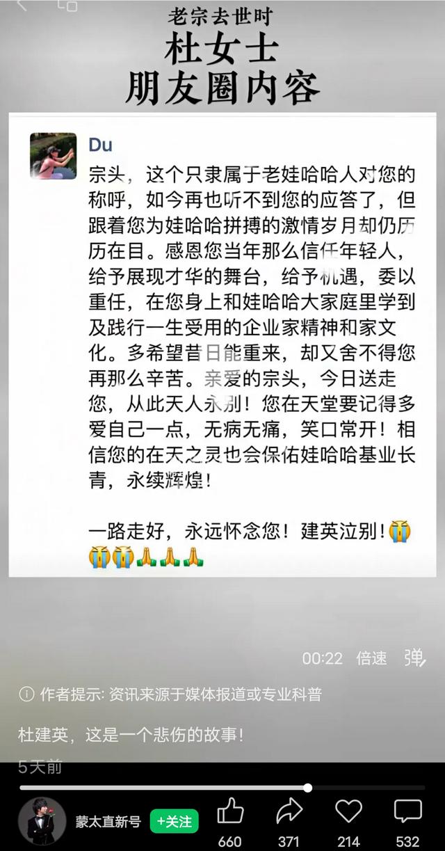 杜建英是娃哈哈元老,虽然离开娃哈哈多年,但与娃哈哈员工还保持微信联系。在宗庆后葬礼过后,送别宗庆后,杜建英还专门发朋友圈怀念。
