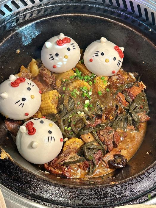 这锅大鹅也太香了!开盖那瞬间直接香到上头,炖得软烂的大鹅搭配豆角和粉条,绝了!他家还有肉龙,吃到撑都没够,最后再来个卡通小馒头,简直完美。