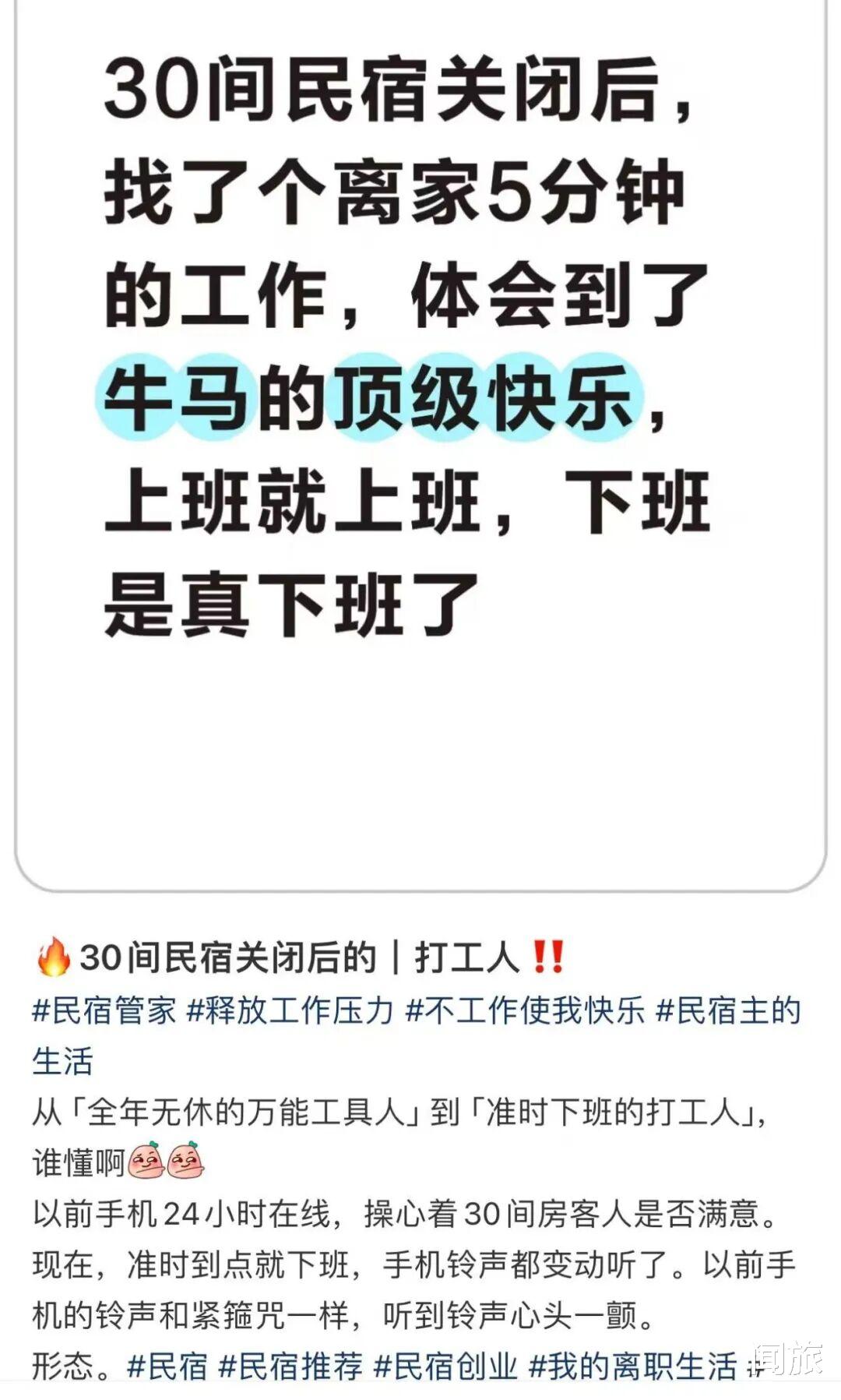 用一位前民宿老板的话说:“当你的24小时不用被客人、水电工、平台、保洁、邻居、消防这些撕成碎片,下班也是一种幸福的自由生活。”