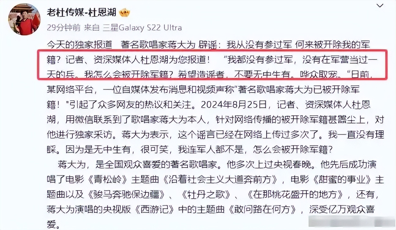 蒋大为解释说,自己从来没有正式参军,也就不存在什么“被开除军籍”一说。