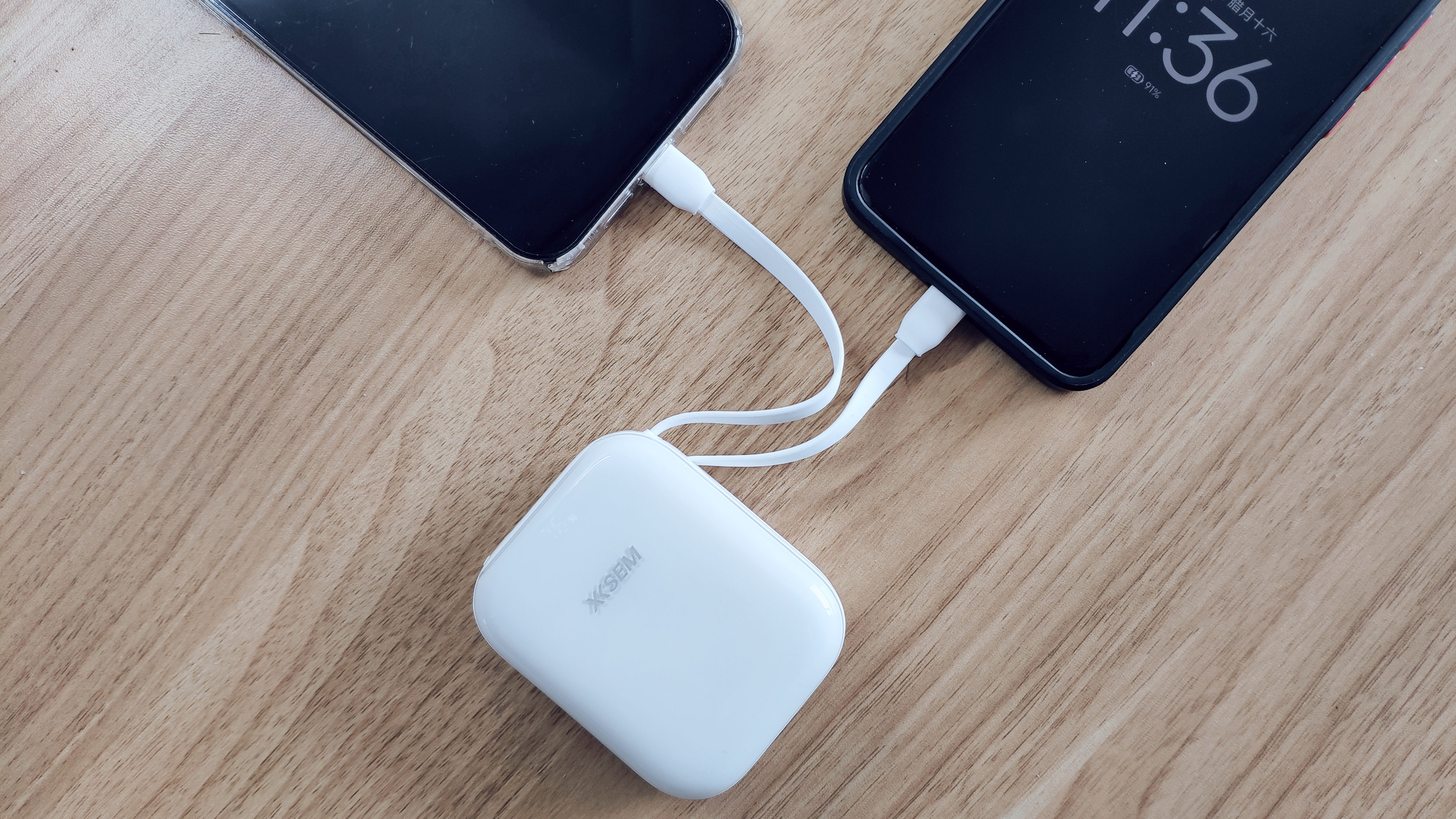 XISEM西圣PB-S半固态充电宝线材与机身一体收纳,采用自带双接口线设计,Lightning与Type-C二合一, 兼容苹果、安卓及平板设备。线体还可作为手绳随手 携带,充电与便携合二为一。