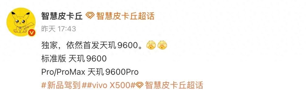 其中没有提到具体的产品系列信息,但带有vivo X500的话题标签。也就是说,新一代的vivo X500将首发天玑9600系列,且不同机型搭载不同版本的9600系列芯片。