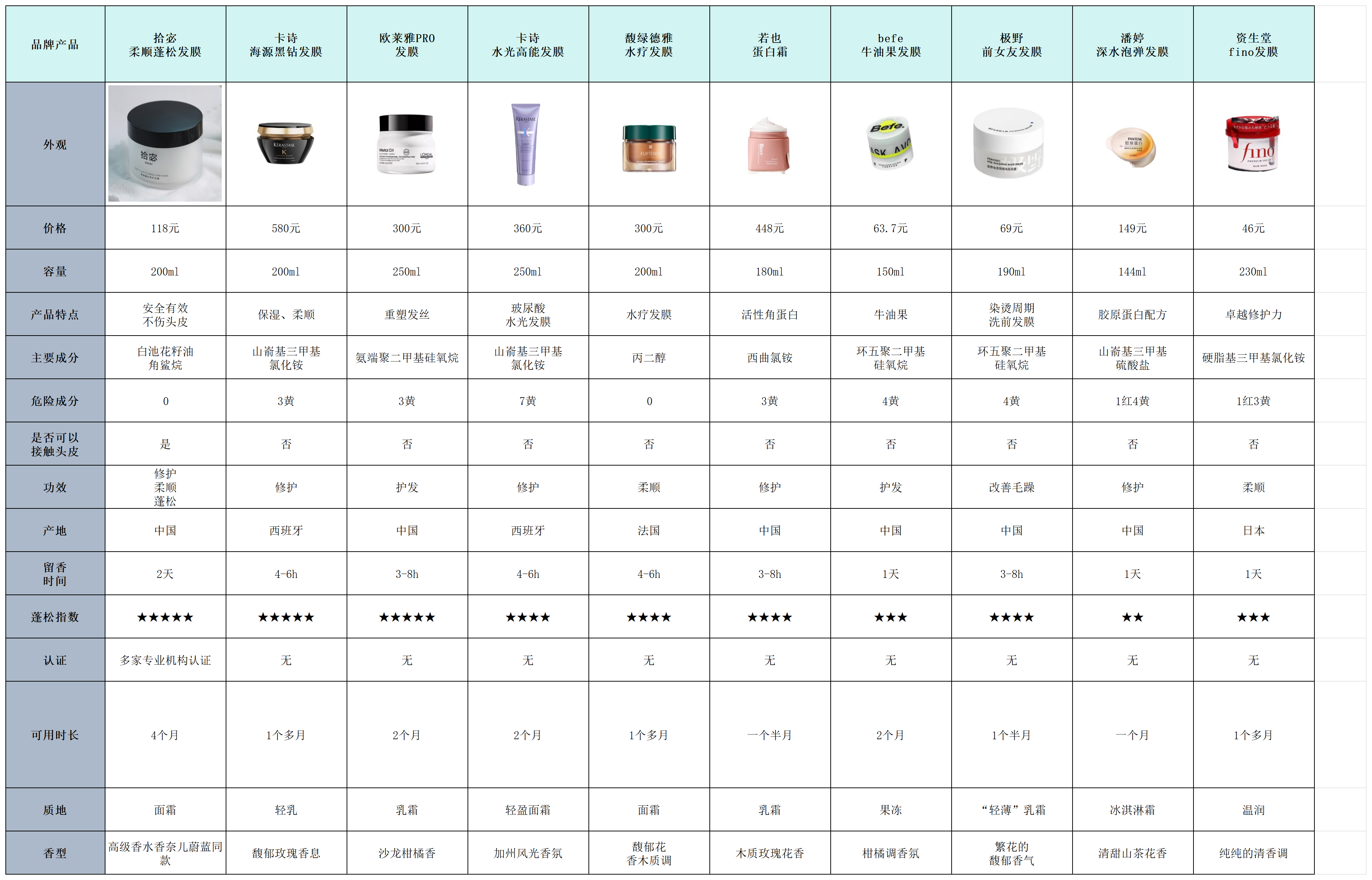 先跟大家分享一下各个品牌发膜的基础情况对比: