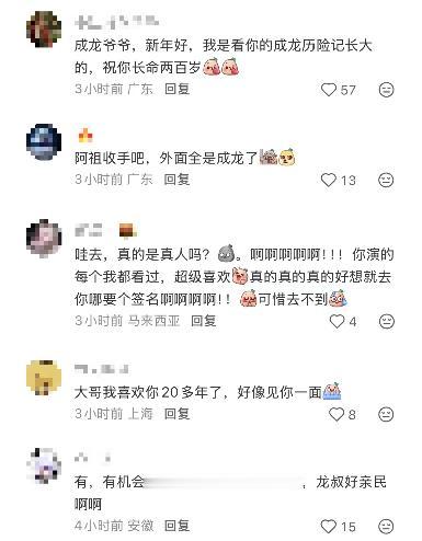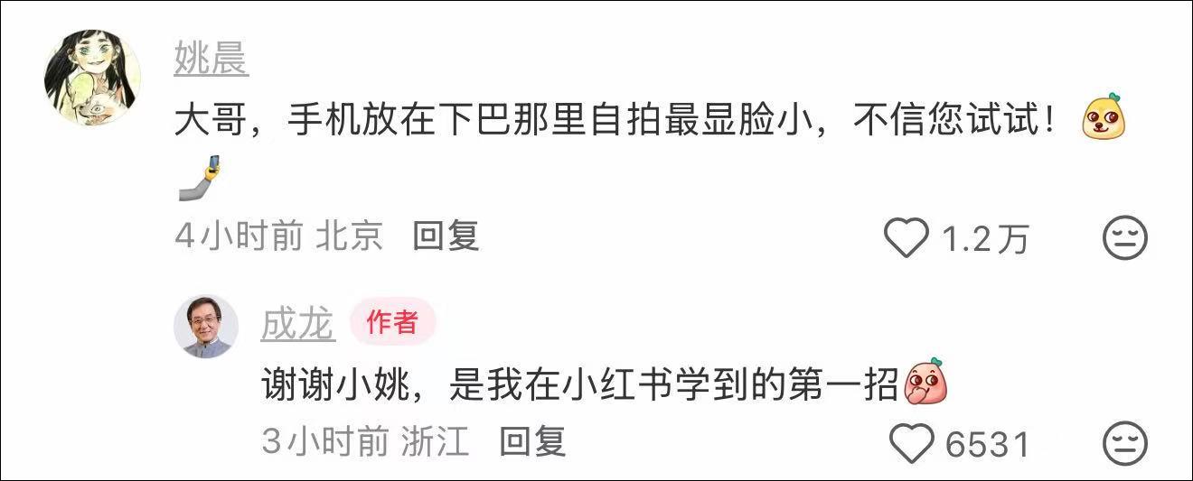 姚晨、金喜善都赶来留言了。姚晨和成龙分享了“自拍显脸小”的技巧:大哥,手机放在下巴那里自拍最显脸小,不信您试试!