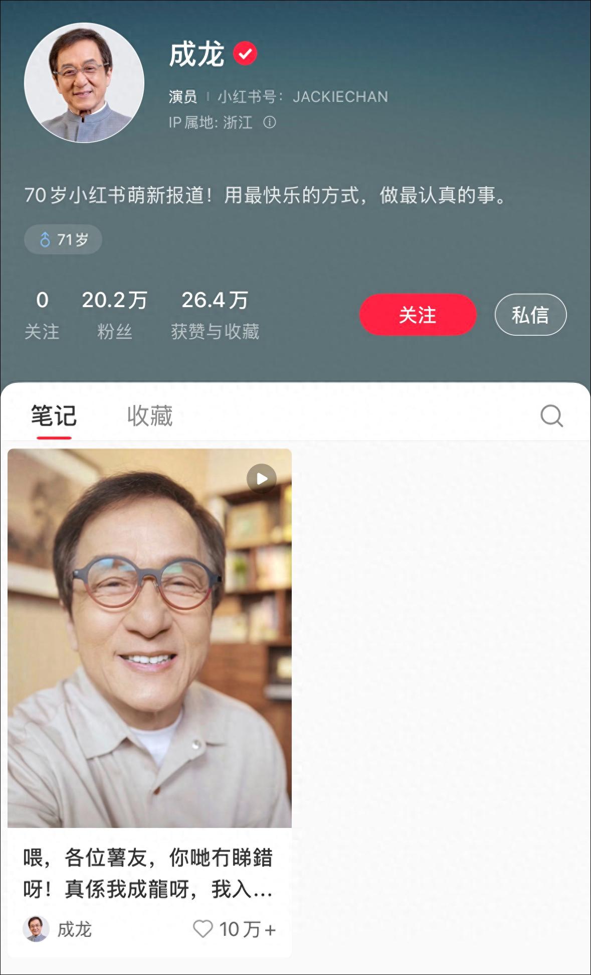 1月30日,70岁功夫巨星成龙开通小红书账号,入驻视频发布4小时涨粉近20万。其简介写道:70岁小红书萌新报道!用最快乐的方式,做最认真的事。