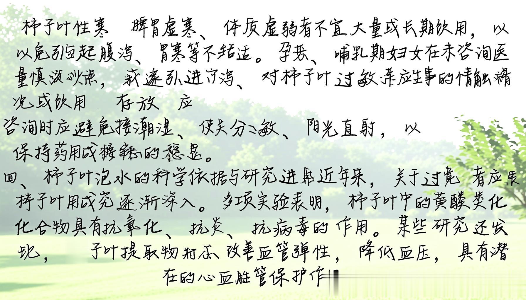 【结语】柿子叶泡水作为一种传统而有效的养生方式,凭借其丰富的营养成分和多方面的药理作用,值得在日常生活中推广和应用。但同时,也应注意个体差异和科学使用原则,才能真正实现其健康价值。