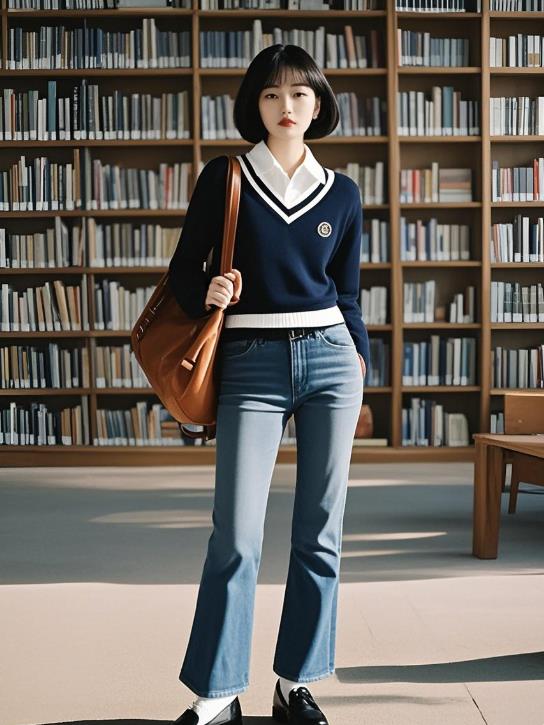 上衣:藏青色V领针织衫(内搭白色衬衫,领子外翻)