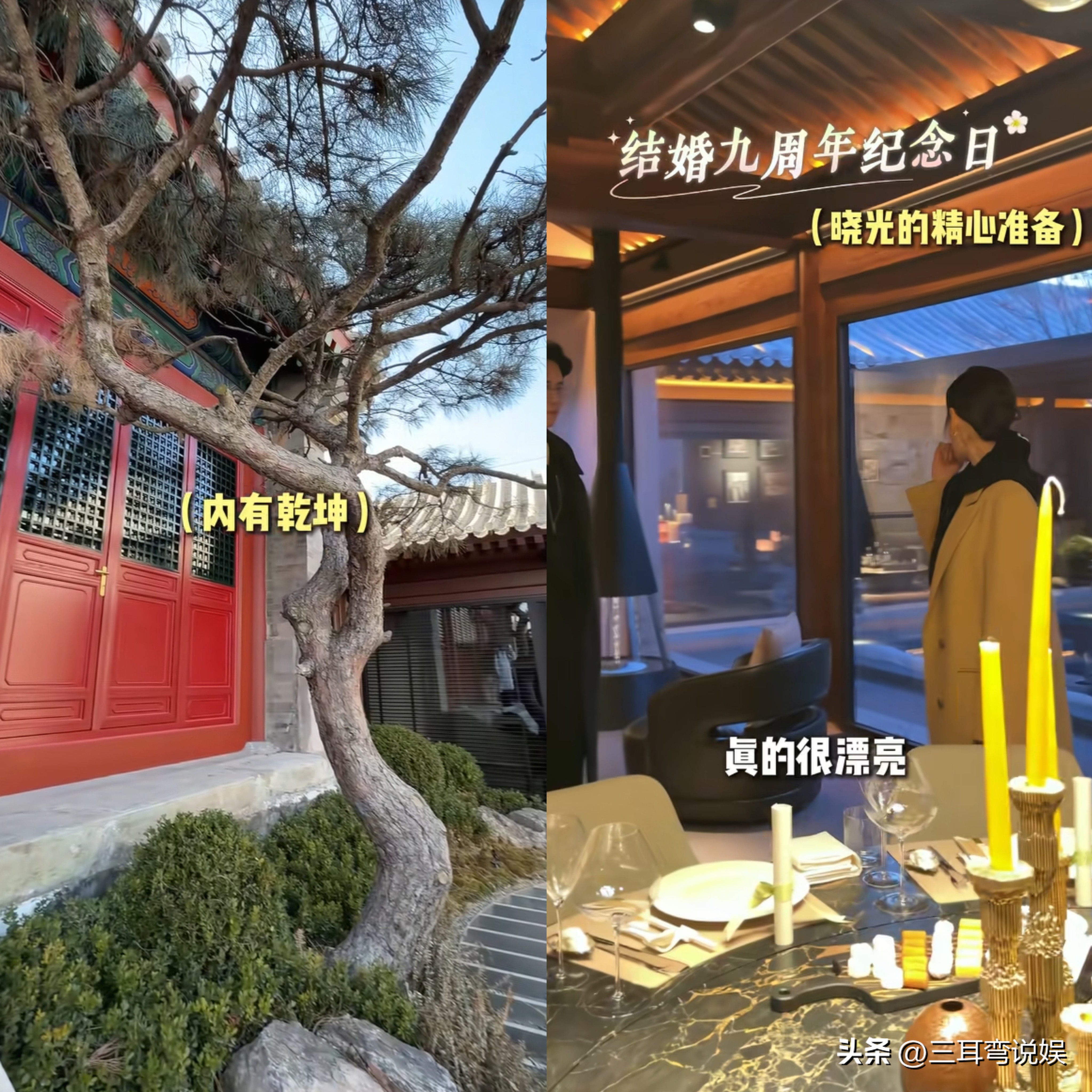 过这个纪念日的地点于晓光选择在有北京特色的四合院,外面的景色独特,里面布置的又温馨,餐食应该是西式的,桌上有红酒杯还有蜡烛,特别浪漫,这样精心的准备得到了秋瓷炫的肯定,直夸特别漂亮。