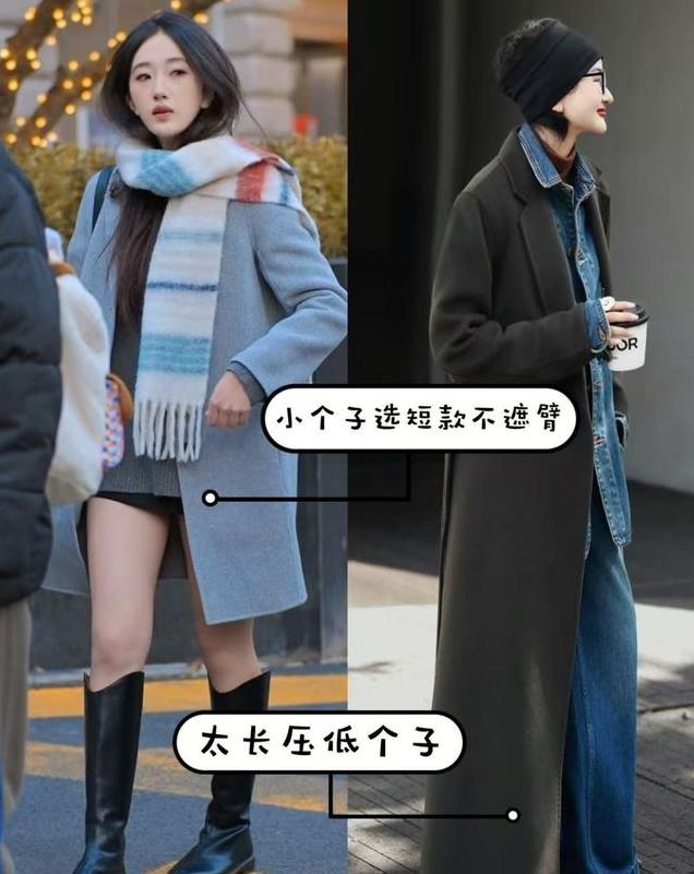 关于大衣的长度,我们可以分为短款、中长款、还有长款的款式,但是对于小个子女生来说的话,如果想要搭配出保险不错的搭配,那么我建议大家可以去选择过臂不过膝的长度,这样的长度显高显腿长。