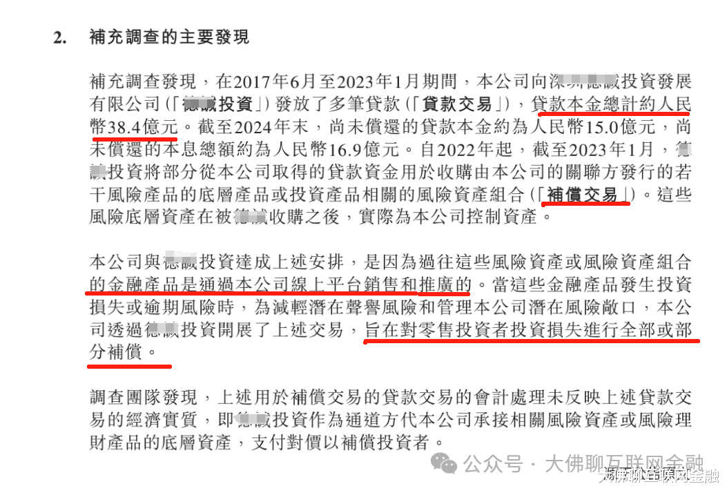 据公告称,2017到2023年期间,陆金所向某第三方公司提供了38.4亿元的贷款,这些贷款由第三方公司拿去收购风险产品的底层资产,由此变相的来补偿相关亏损的投资者。