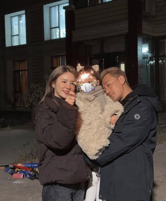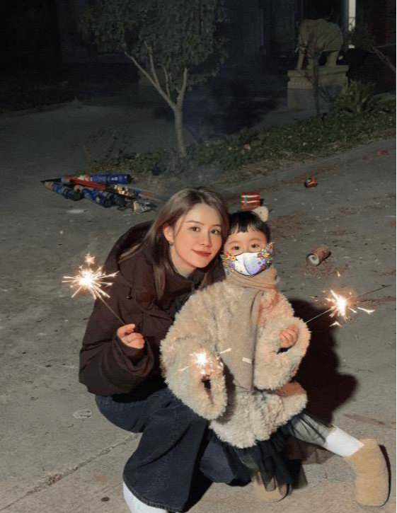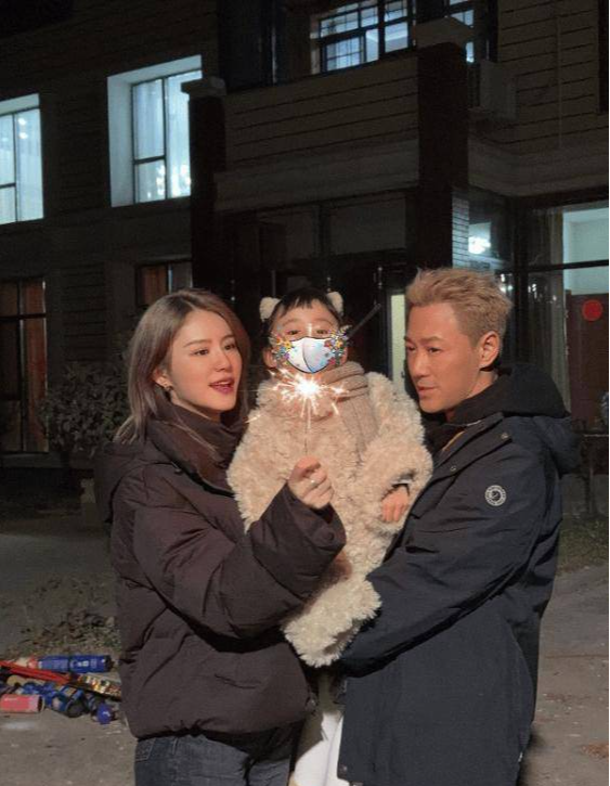 林峯近日和太太张馨月带着 5 岁的女儿Luna(乳名格格)回张馨月江苏娘家过年,一家三口在除夕夜放烟花,可见女儿眉清目秀