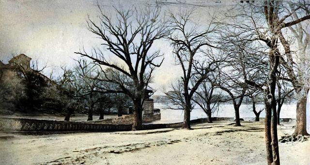 这就是以前岸边倚晴楼和那条游廊的模样。游廊大概三百米长,弯成了个半圆,绕着北海湖边的琼岛北坡。它的东边接着倚晴楼,西边则连着分凉阁。
