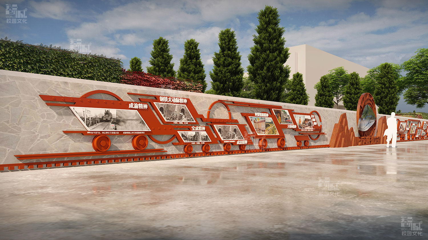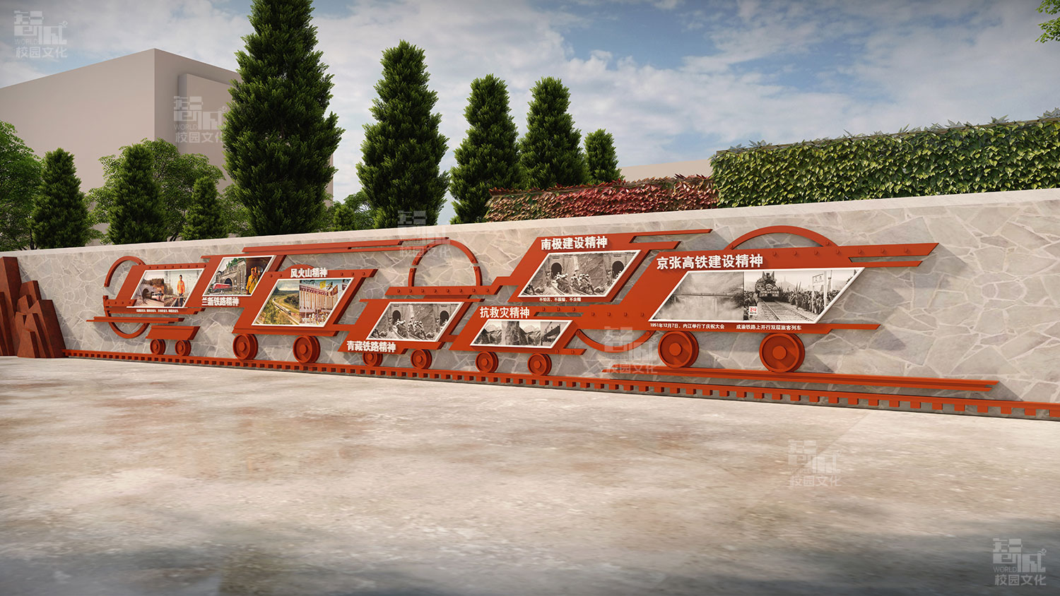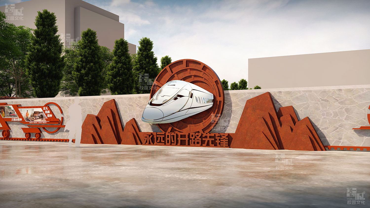 因此,我们在学校广场的挡土墙两侧位置分别设计了现代火车头和蒸汽火车头穿越隧道的造型,简要的展现出我国的火车发展已经旧貌换了新颜,体现中国中铁数十万员工不畏艰险、不怕困难,在国家基础设施特别是铁路建设中书写了气壮山河的光辉篇章。火车头造型上面立体展示“永远的开路先锋”文字,突出开路先锋主题。