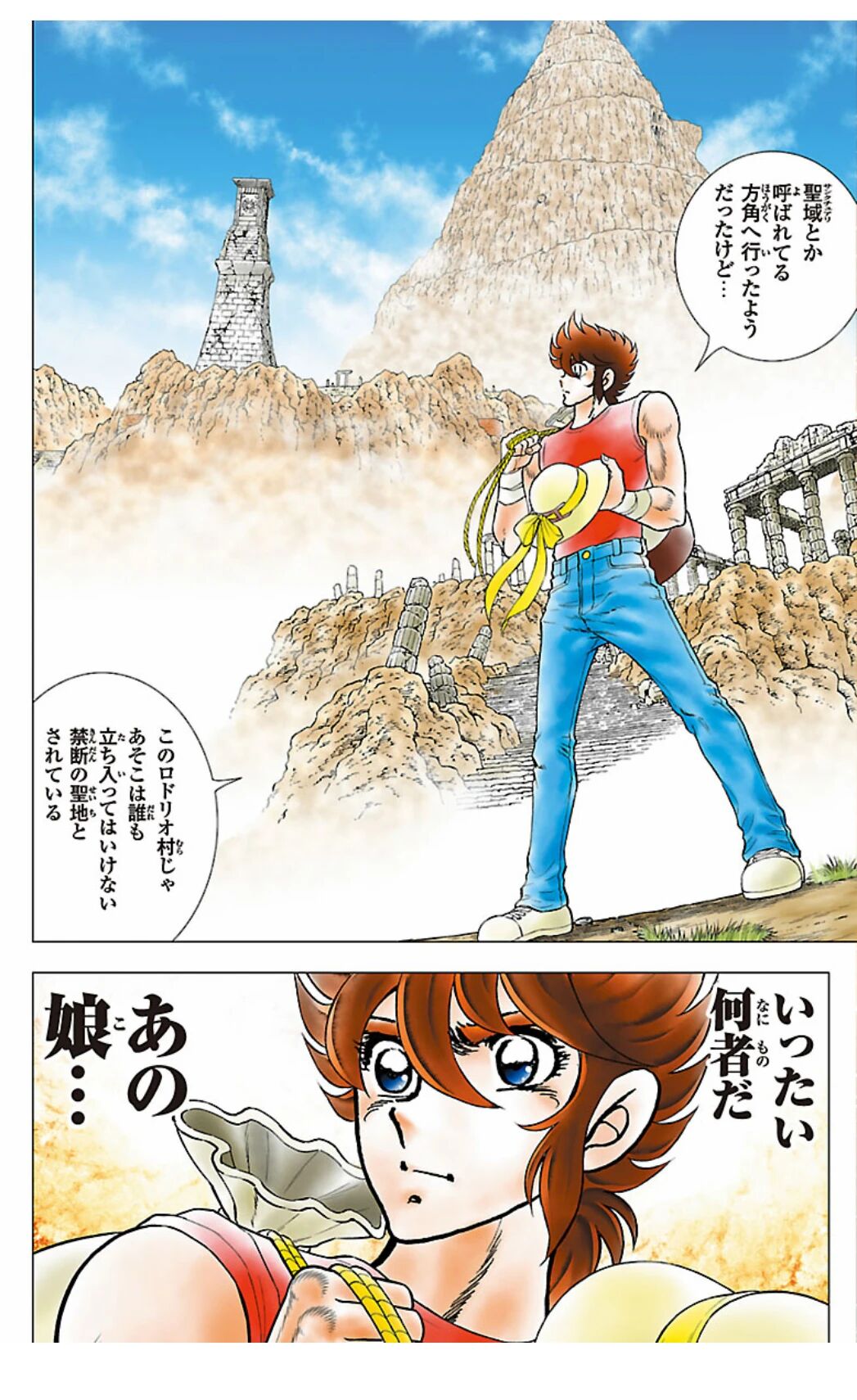 画面切换,星矢看着远方的圣域继续说:“好像是朝着被称为圣域的方向去了,那里是不允许任何人进入的禁忌之圣地,罗德里奥村”。