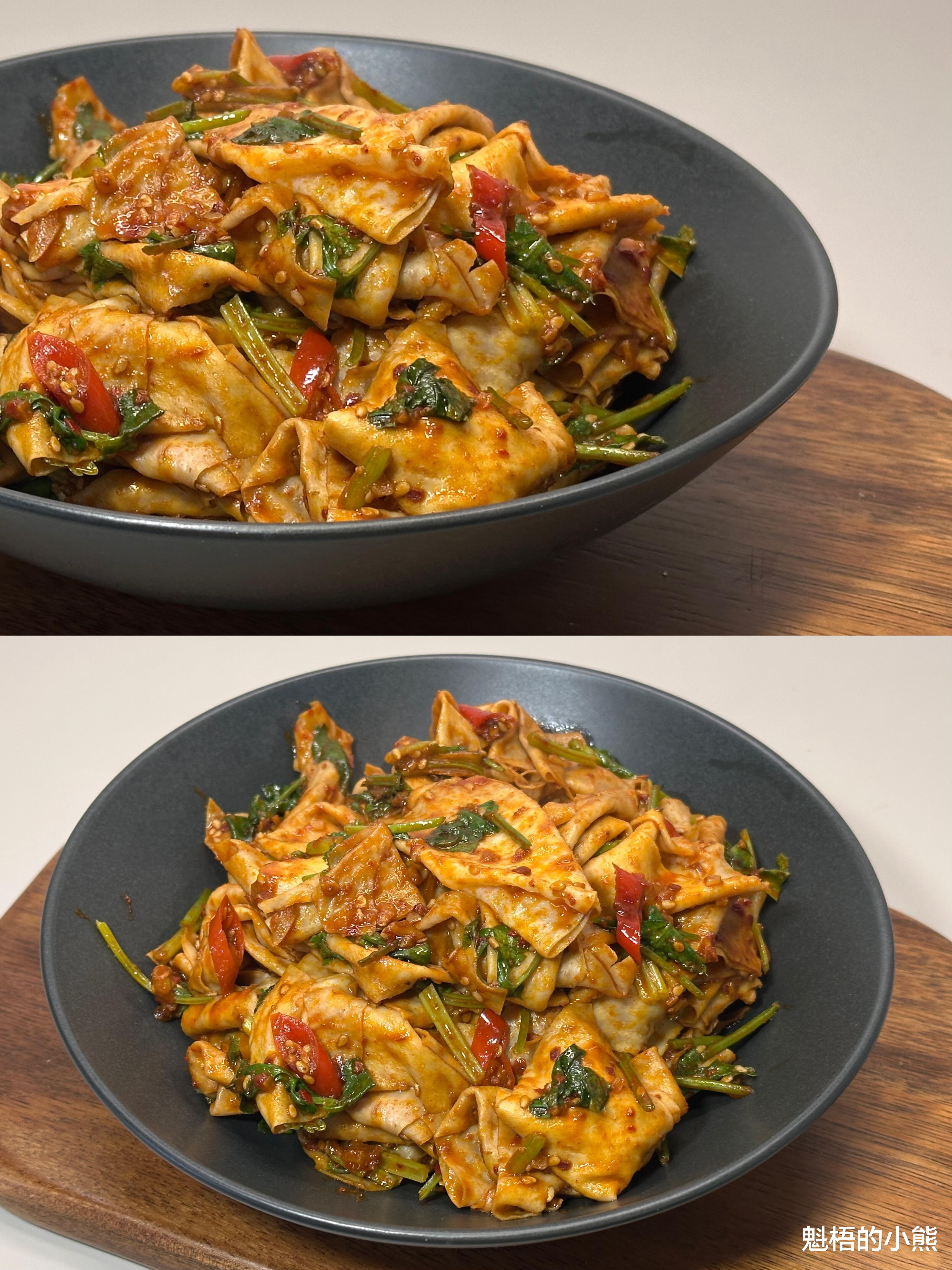 这道香辣孜然豆皮,从准备到出锅,用不了二十分钟。豆皮泡一泡焯个水,酱汁炒一炒,放进去拌匀就好。不用复杂的工序,不用盯着火候,厨房小白也能轻松搞定。当菜可以,当夹馒头的馅料更绝。