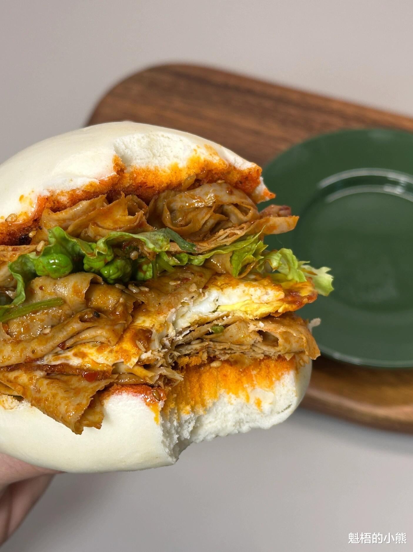 热乎乎的大馒头从中间掰开,夹几片豆皮进去,再放个煎蛋,一口咬下去——馒头松软,豆皮香辣,煎蛋流心,绝了。早餐吃一个,一上午都不饿;晚餐吃一个,比什么都满足。