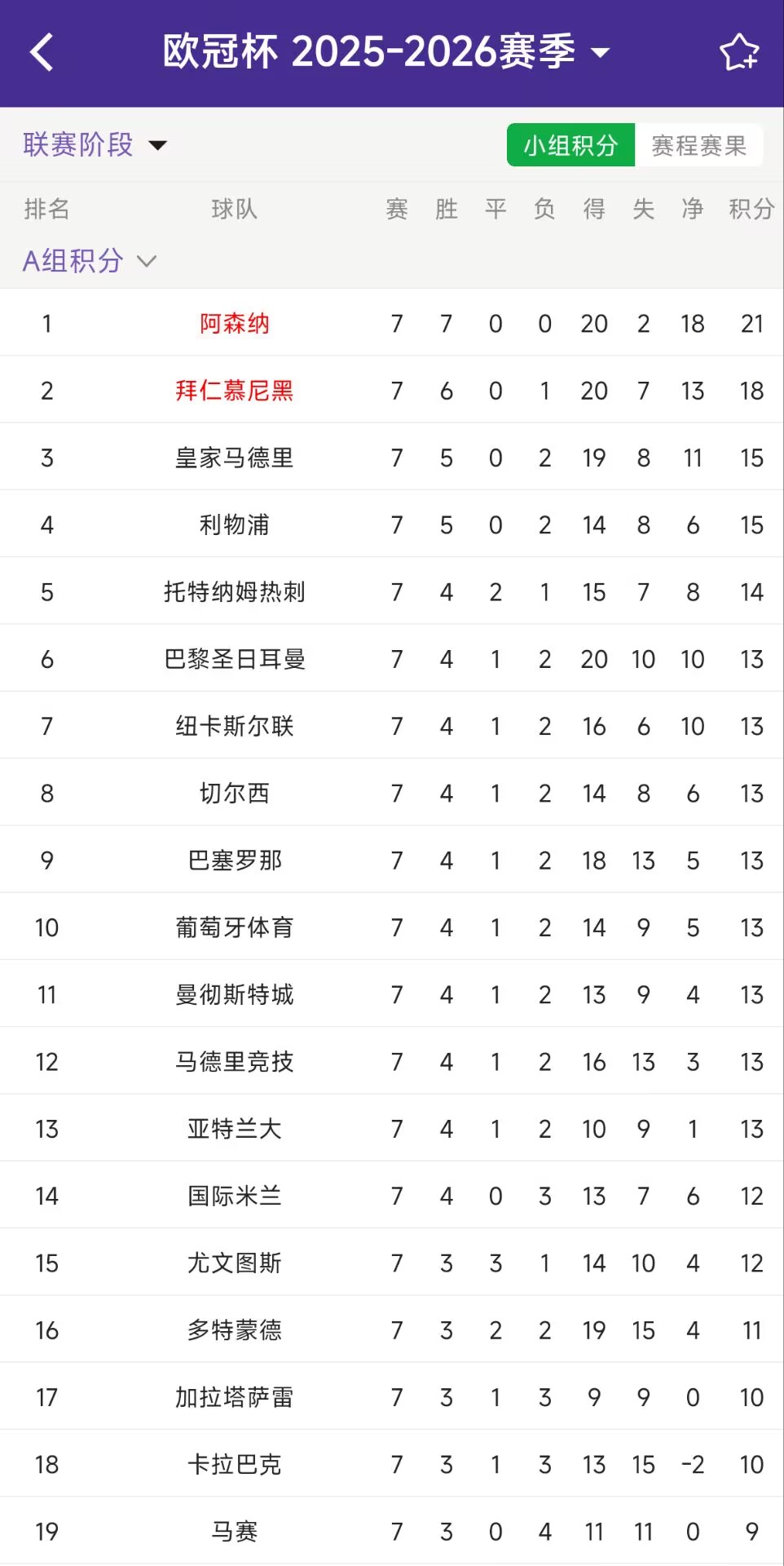 阿森纳目前以 21 分、净胜球 +18 高居榜首,是欧冠联赛阶段唯一保持全胜(7 战 7 胜)的球队。