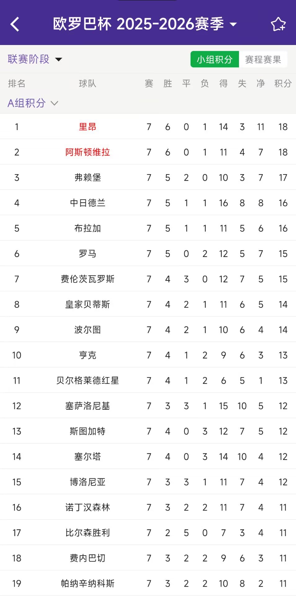 维拉目前 18 分排名第 2,与里昂一起,成为唯二提前锁定16强席位的球队。