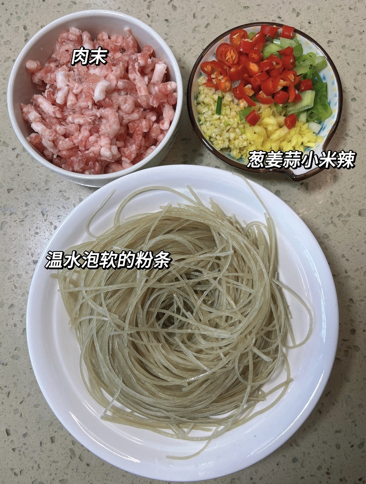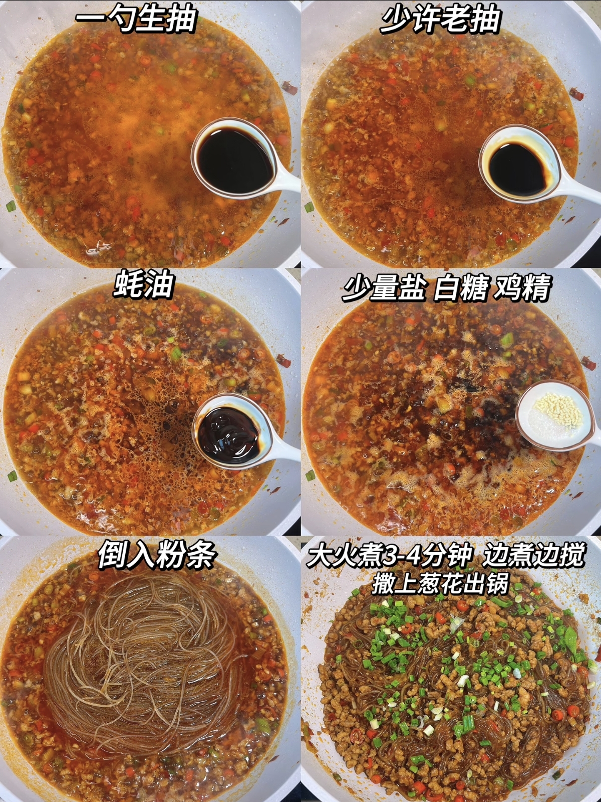 准备食材时无需繁复,三分肥七分瘦的猪肉末是口感的关键,肥油能让肉末更香,瘦肉则保证了扎实的肉感,红薯粉条要选纯红薯制作的,提前用温水泡至柔软无硬芯,煮后才会筋道不碎,吸饱汤汁也不易软烂。葱姜蒜与小米辣切得细碎,葱的清香、姜的辛辣、蒜的浓郁与小米辣的鲜辣交织,是这道菜香辣风味的基底,一勺郫县豆瓣酱更是灵魂,能炒出透亮红油,赋予菜品诱人的色泽与醇厚的咸香,生抽、老抽、蚝油与少许盐、糖、鸡精,简单调味便能勾勒出层次丰富的味道,不用过多调料,反而能凸显食材本身的鲜美。