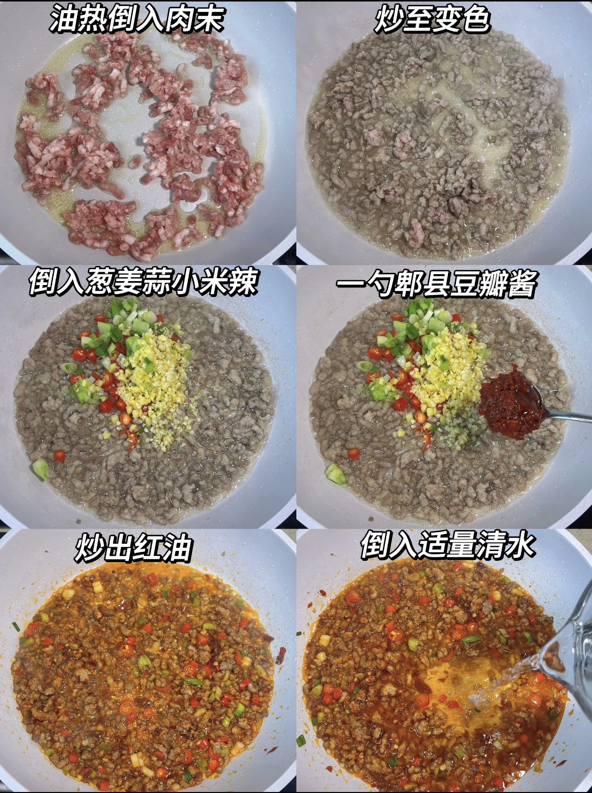 炒制的过程满是烟火气的治愈,热锅倒入适量食用油,油热后下入肉末,中火慢慢翻炒,直到肉末变色出油,颗粒分明地散在锅中,油脂的香气渐渐弥漫开来,这一步要耐心炒散肉末,避免结块,让每一粒肉末都充分释放香味。接着倒入切好的葱姜蒜与小米辣,快速翻炒出香,再加入一勺郫县豆瓣酱,转小火慢慢煸炒,直到红油析出,酱料的咸香与辣椒的鲜辣彻底融合,红亮的油光裹着细碎的香料,光是闻着就让人食欲大开。