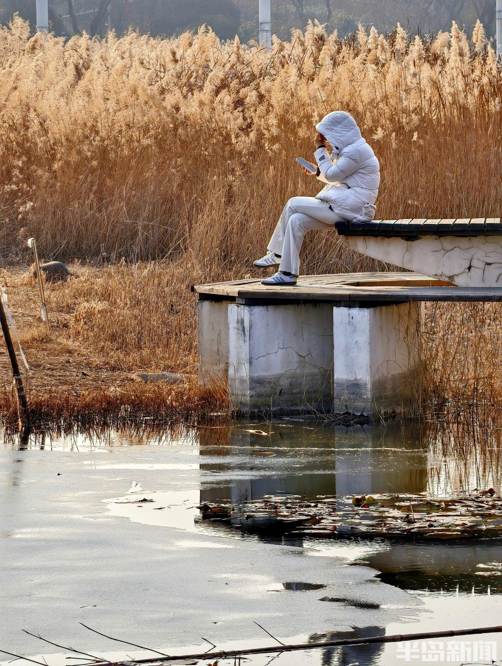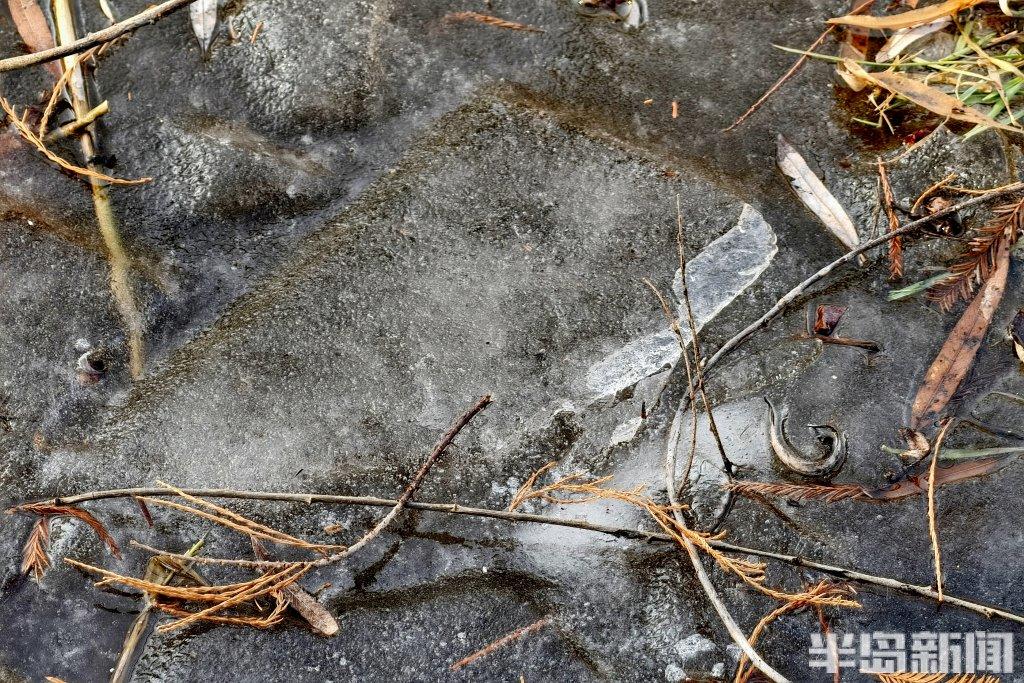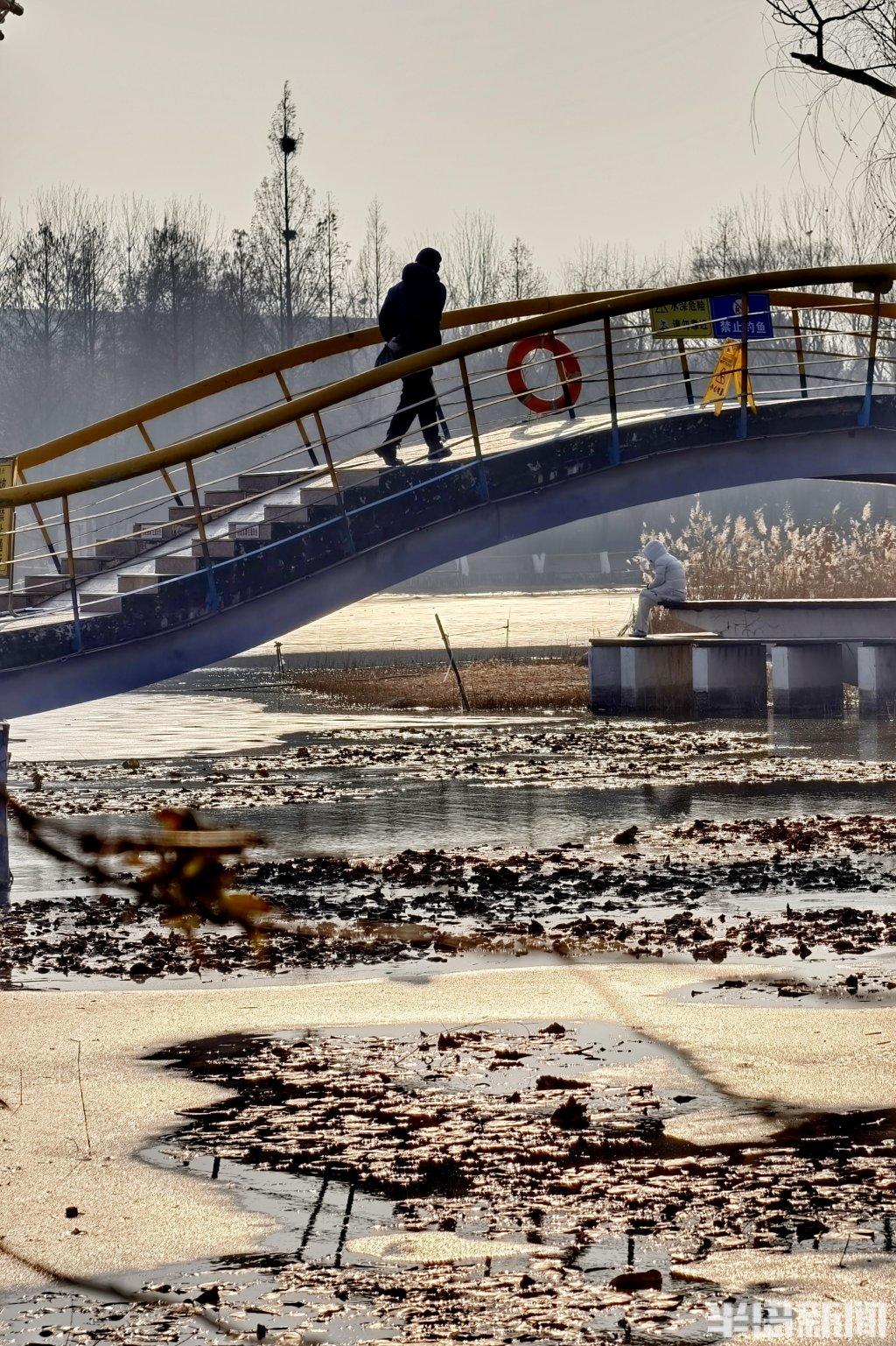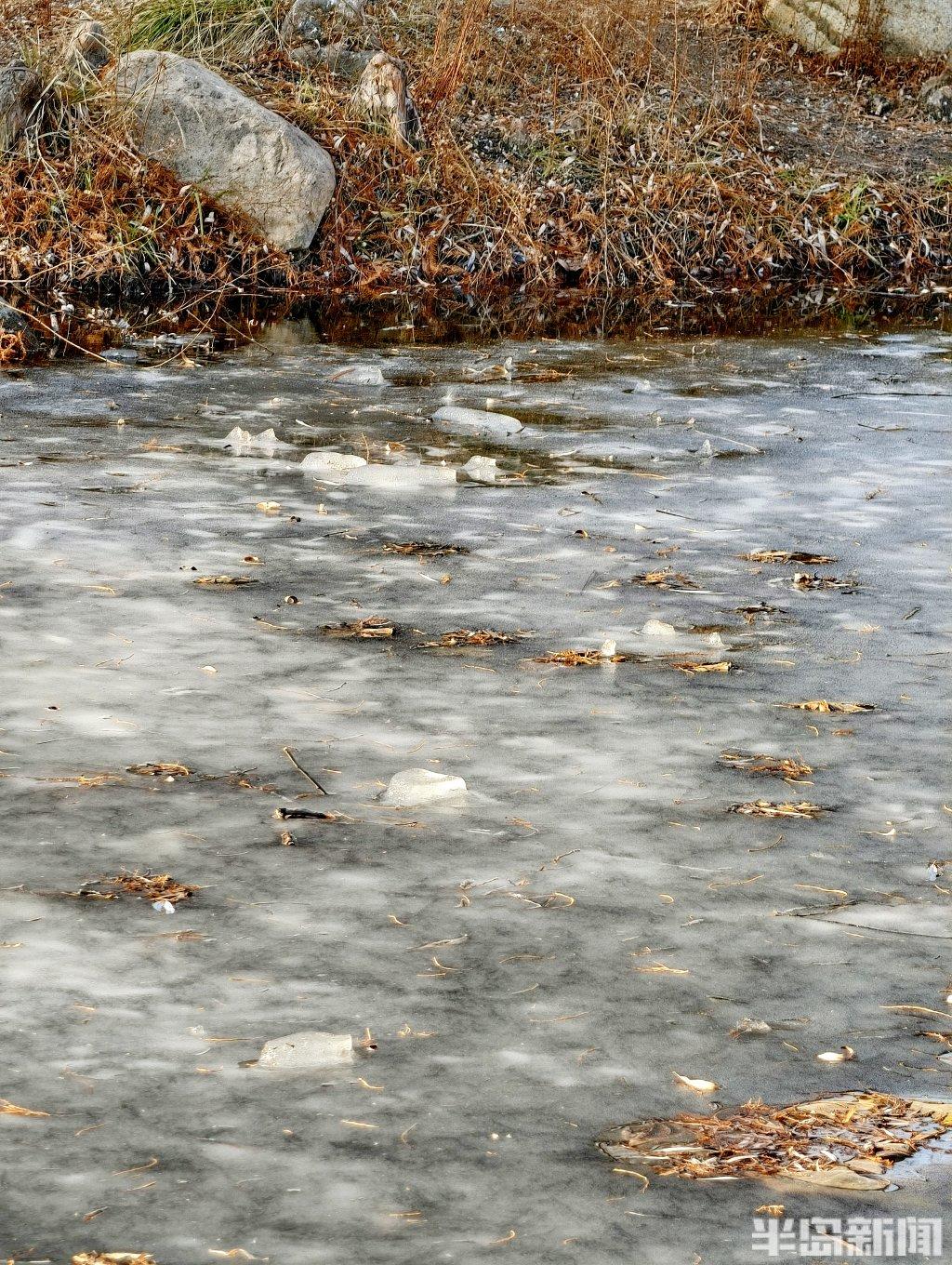 1月9日,随着冷空气持续影响,青岛奥林匹克雕塑文化园内部分河道已悄然冰封。尽管天气寒冷,仍有不少市民来此漫步,薄冰覆盖的水面映着暖阳,与岸边尚未完全结冰的潺潺流水形成对比,构成一幅动静相宜的冬日画卷。