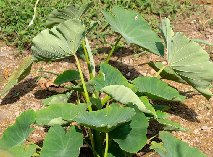 等这些都弄好了,再把芋头苗小心翼翼地放进去,扶正,然后再慢慢地往坑里填土。填土的时候要注意,一边填一边轻轻往上提一下芋头苗,让根部能够舒展开来。填到一半的时候,稍微停一下,浇一点水,但是水不能太多,不然又会让根部积水烂根了。然后再继续填土,直到把坑填满为止。