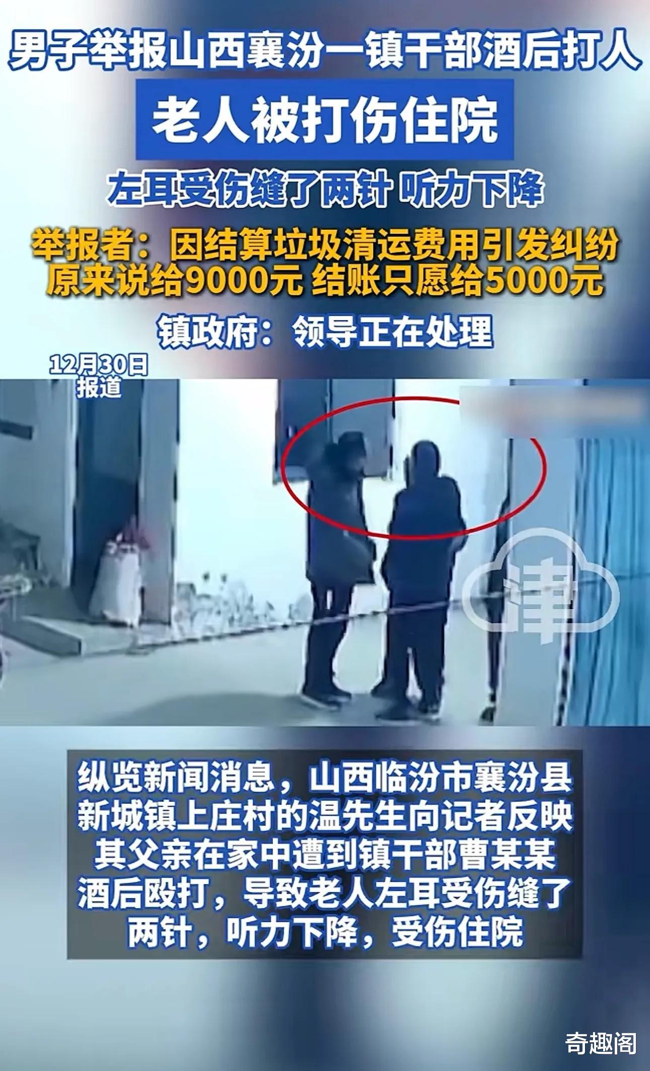 2025年12月29日,山西一位姓温的男子,向媒体透露,临汾市襄汾县的一位镇干部曹某某,在酒后殴打了他的父亲。之后,该媒体便报道了此事,据了解这起冲突的原因是这样的。2025年4月到12月,温先生的父亲负责清运村内三个垃圾池的垃圾,这项工作是由新城镇的包村干部曹某某安排。