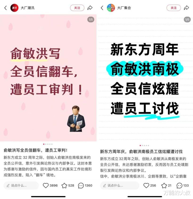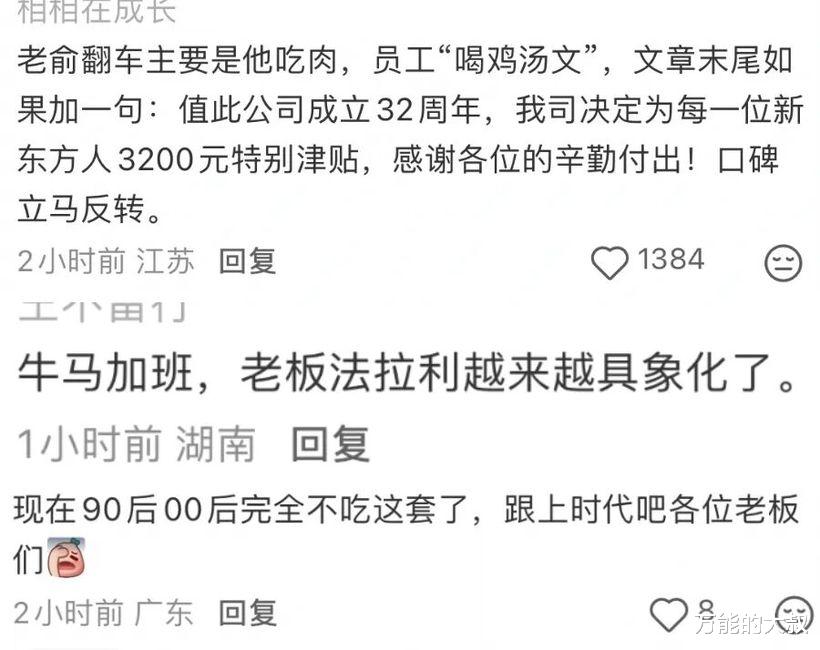 网友2:老俞翻车主要是他吃肉,员工“喝鸡汤文”,文章末尾如果加一句:值此公司成立32周年,我司决定为每一位新东方人3200元特别津贴,感谢各位的辛勤付出!口碑立马反转。