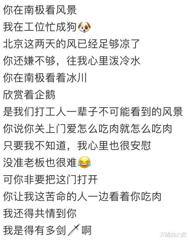 网友3:贼想回复他:没必要强调你在南极旅游,因为我们在苦命加班还没有加班费