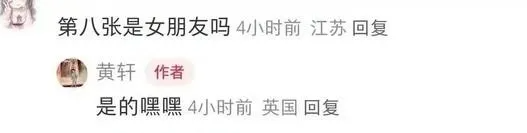晒完照片后,网友立刻询问照片中的女生是不是他女友,这次黄轩大方承认,回复:是的,嘿嘿。