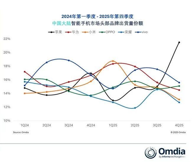 但这种上扬态势未能持续到年底,随着四季度iPhone 17系列上市,苹果拿走了绝大部分市场份额。相关数据显示,苹果当季市场份额达到22%,年增长率高达26%,多数中国品牌均出现明显下滑,荣耀再度被挤出前五阵营。