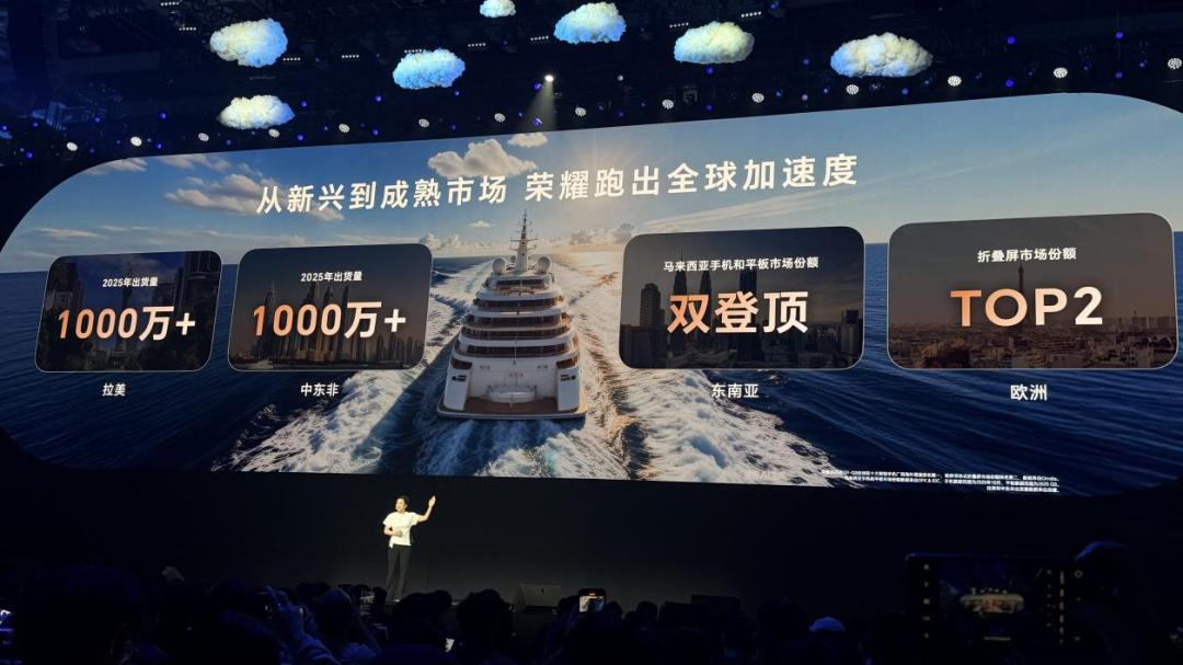 在荣耀Magic8 Pro Air新品发布会上,荣耀产品线总裁方飞表示,2025年荣耀在拉美、中东非等市场出货量超1000万台,马来西亚手机和平板市场份额双登顶,欧洲折叠屏市场份额进入前二。