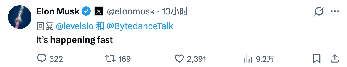 2026年2月12日,特斯拉创始人兼首席执行官埃隆·马斯克在社交媒体平台点评字节跳动Seedance 2.0生成的视频时表示,“It’s happening fast(模型发展速度太快了)”。