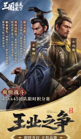 王业之争以45V45的阵营对抗为核心,积分决胜的机制让个人与阵营积分相辅相成,多劳多得,不管是前线杀敌还是后方开垦,每个玩家都能在对局中找到自己的位置,为阵营贡献力量。平均不到一小时的快节奏对局,让兄弟们不用长时间等待,凑齐人就能即刻出发;局内还贴心安排好了武将等级、资源,武将补兵加速、重伤快速恢复、秒回城的设置拉满续航,大家只管排兵布阵尽情战斗。