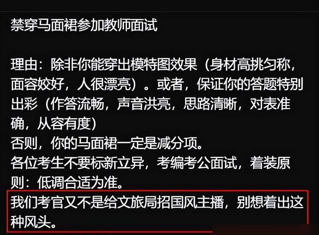 事情的结果也不出所料。这名女生不仅没有用马面裙赢得考官的青睐,反而以极低的分数被淘汰。考官在事后无奈地表示:“最烦爱出风头的!”这句话乍听有些刺耳,但细细琢磨,却道出了面试背后更深层次的期望。