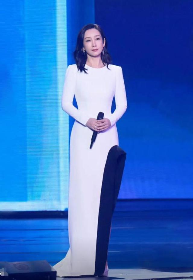 这不,当章子怡来到舞台上后,她的天鹅颈又出现了,衬托的脸很小,像20出头的姑娘。