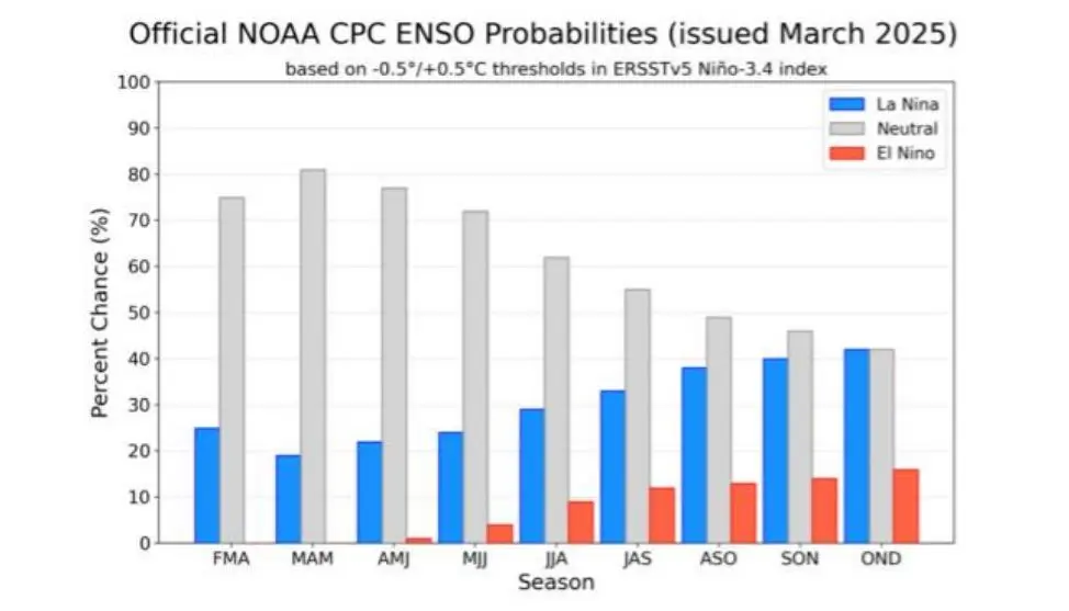 而3月NOAA发布拉尼娜发展趋势也说明了,其预计二月到四月的平均值,有75%的机会是厄尔尼诺-南方涛动中性,也就是说,不是拉尼娜,也不是厄尔尼诺,而这个保持趋势在夏季是最有可能的,不会发生转变。