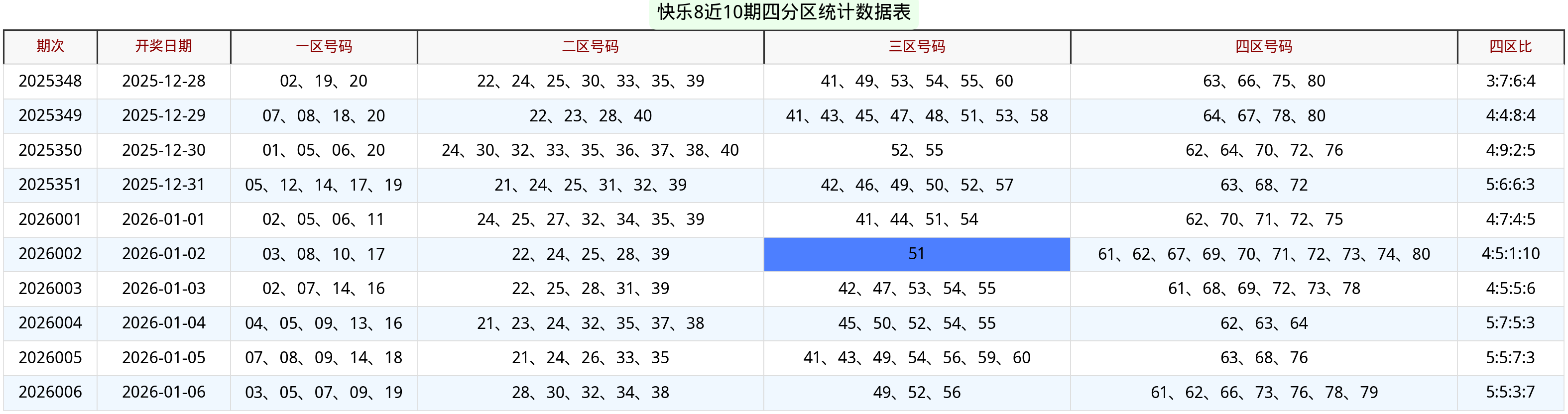 四区分布规律解析快乐8近10期四区总比为43:60:47:50,二区(21-40)明显过热,平均达6.0个,而一区(01-20)仅4.3个,长期偏低。但从近五期走势看,一区已由3→4→4→5→5逐步回升,呈现温和回暖迹象。四区(61-80)在上期开出7个,远超均值5.0,存在短期回调可能。然而,由于四区内部结构丰富、热码密集,仍具持续出号能力。综合判断,本期可能出现“一区稳中有升、二区降温、三区补位、四区高位震荡”的格局。像65、67这类位于四区分界带的号码,兼具冷温转换属性,具备较强入选概率。