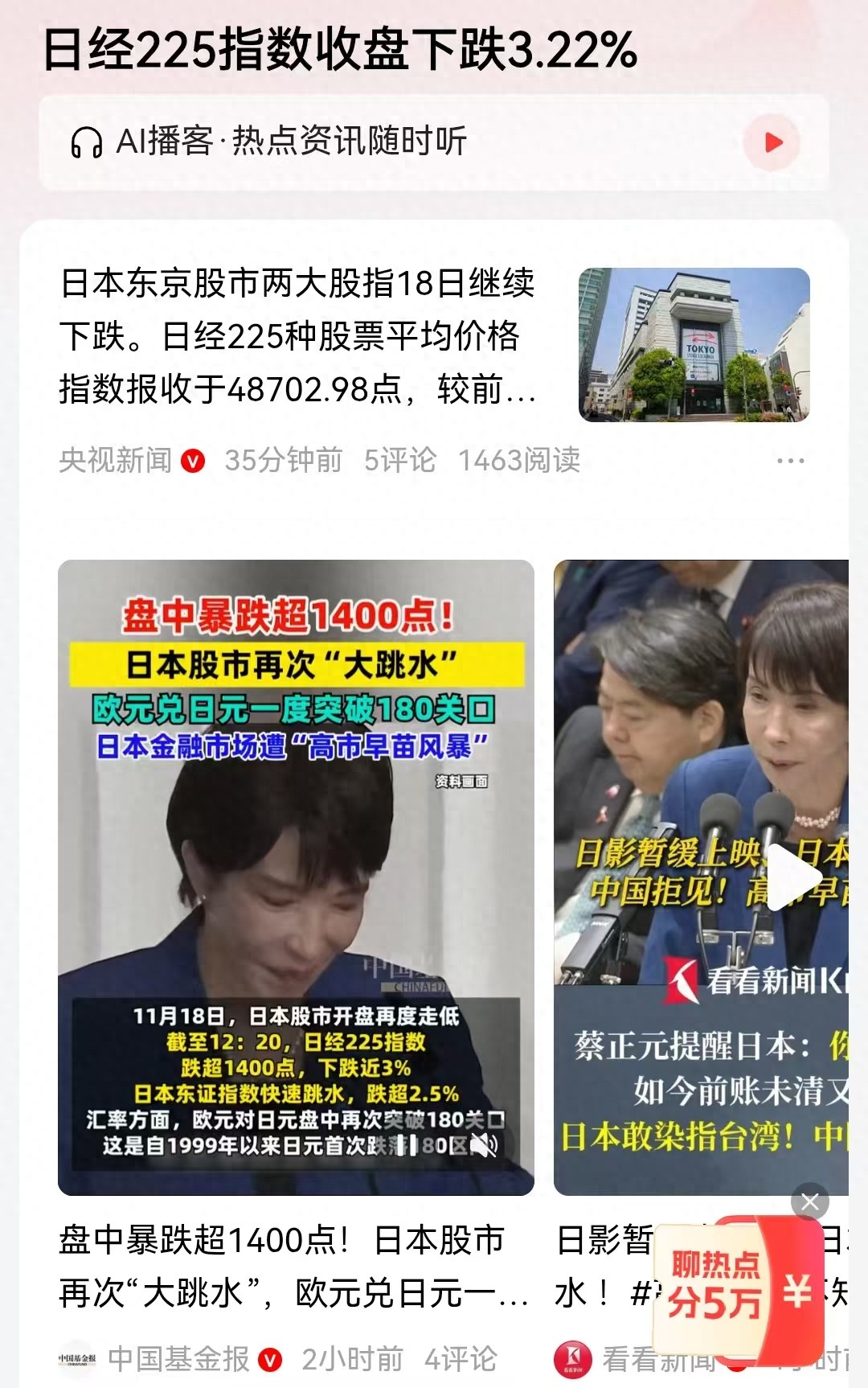 从股市方面,先是日本旅游和消费股板块在17日重挫下跌,再是18日整体日本股市重度下跌。危机正在扩散, 日经225指数大跌3.32%,这可是一个巨大的跌幅。高市早苗成为日本新首相之后,日本股市整体下跌已经超过10%,日本的牛市即将终结。上一次还是特朗普在半年前公布对等关税政策时造就的日本股市大跌。