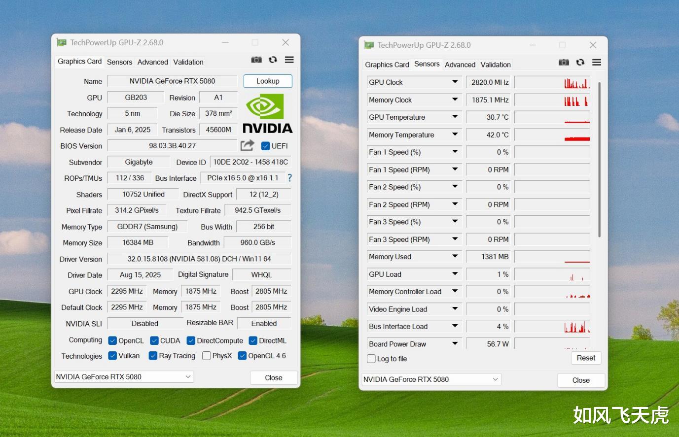 运行GPU-Z,我们看下显卡的配置。RTX 5080,采用Blackwell架构GB203芯片,5nm工艺制程,拥有10752个CUDA核心和336个第五代Tensor Core,来自三星的16GB GDDR7显存,带宽960GB/s,基础频率2295MHz,支持DLSS 4和PCIe 5.0。这款技嘉RTX5080超级雕ICE的加速频率达到2805MHz,比公版2655MHz高一些,意味着性能表现更强。说到RTX 5080,它配备第四代 RT Cores,光线三角形相交率提升至前代2倍,并优化压缩以减少内存占用。支持DLSS 4多帧生成,凭借硬件级Flip Metering实现更稳定的高帧率体验。通过PCIe 5.0与DisplayPort 2.1b UHBR20,可驱动8K 165Hz显示器。采用GB203核心,拥有10752个CUDA单元、336个第五代Tensor Core,搭配30Gbps高速GDDR7显存,为AI与游戏性能带来全面跃升。