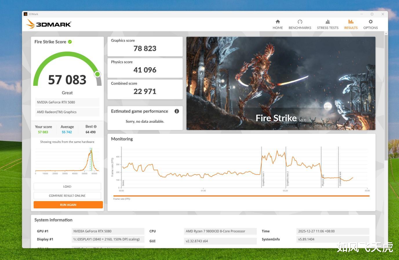 3DMARK Fire Strike测试,总分57083,其中图形得分78823,物理得分41096,综合得分22971。