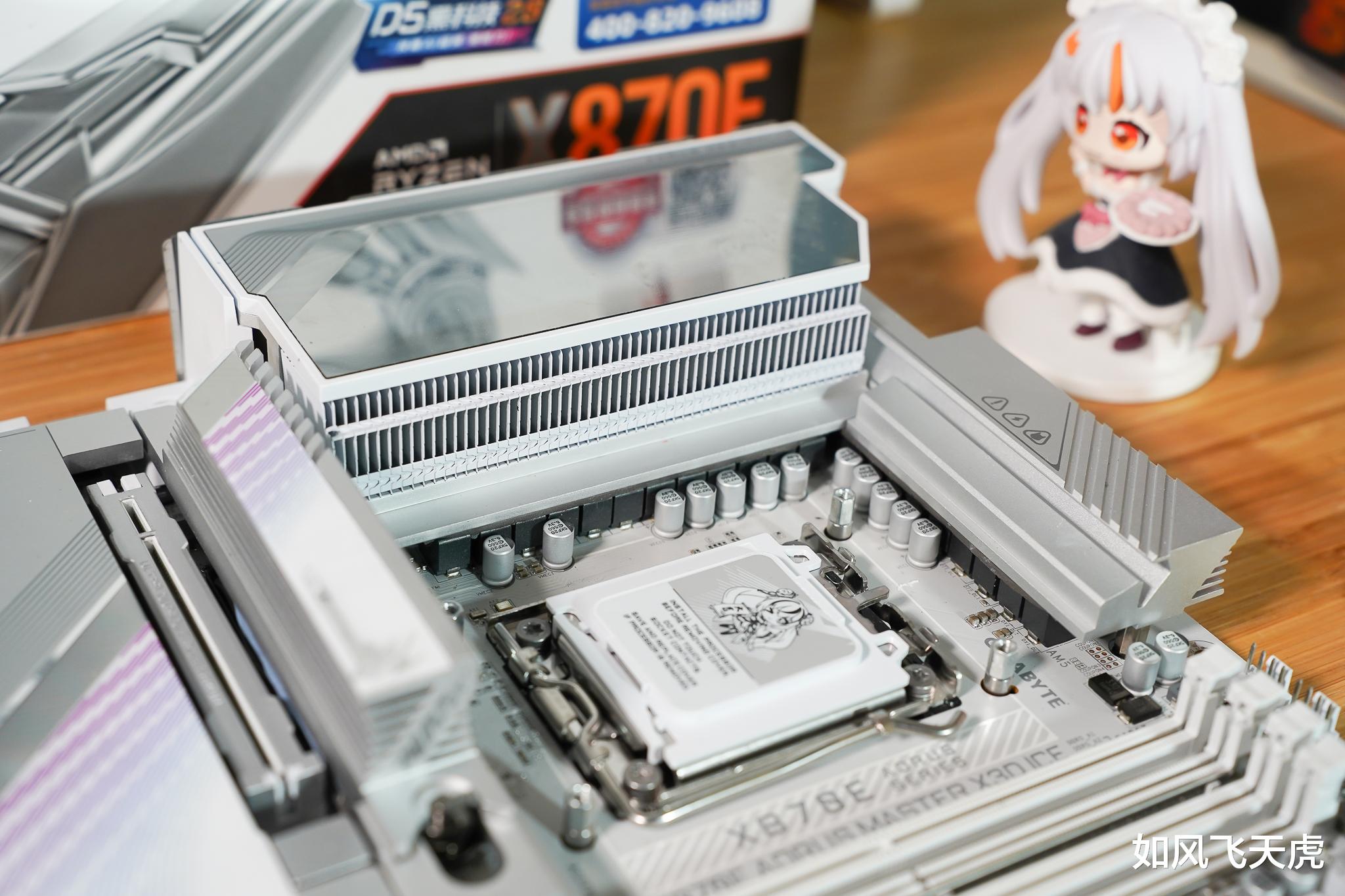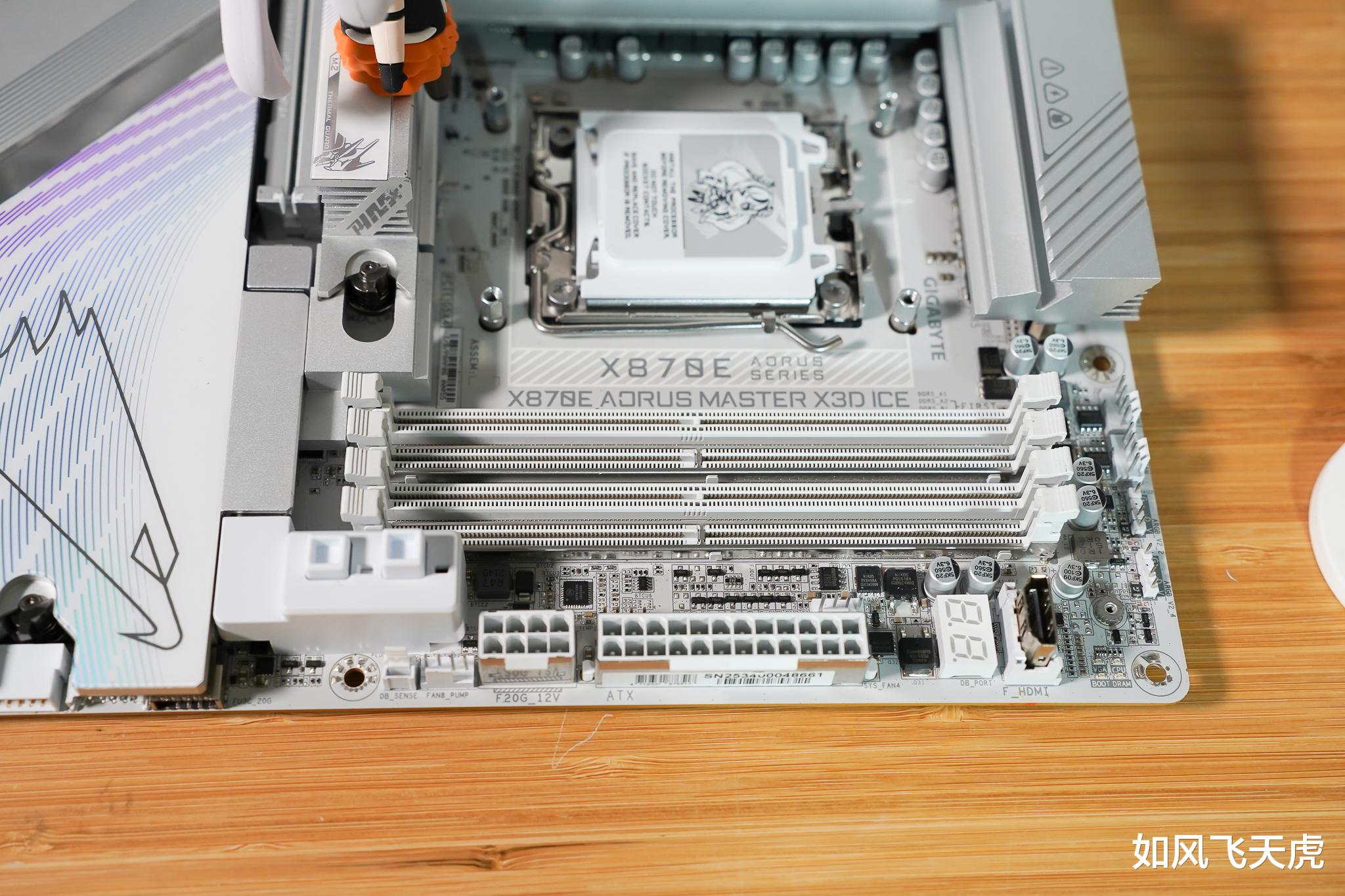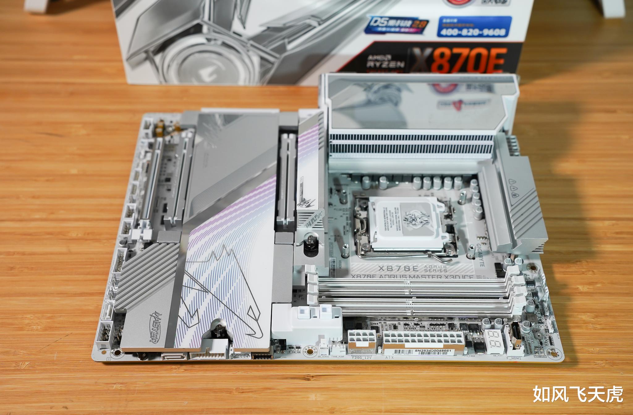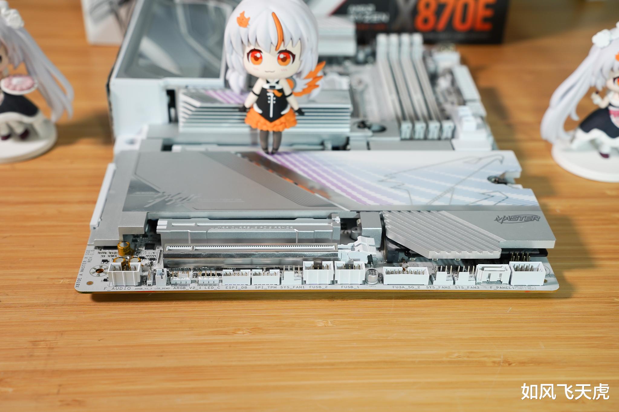 我们看这款技嘉X870E AORUS MASTER X3D ICE超级冰雕主板,通体纯白,从散热片到接口、电容、盖板,全都统一配色,干净利落。散热装甲还带冰纹雕刻,光影一照,冷感十足,像件白瓷艺术品,又酷又高级。