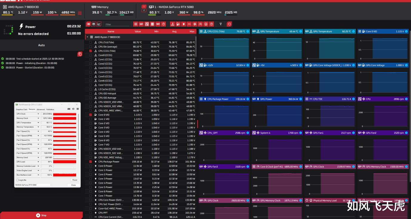 更换另一种软件进行CPU和GPU双烤机,此时CPU功耗160W,GPU360W,GPU频率2812MHz附近波动,那么就是CPU温度上升到了80度,GPU核心温度依旧是60.1°C,显存温度58°C,可谓十分清凉。