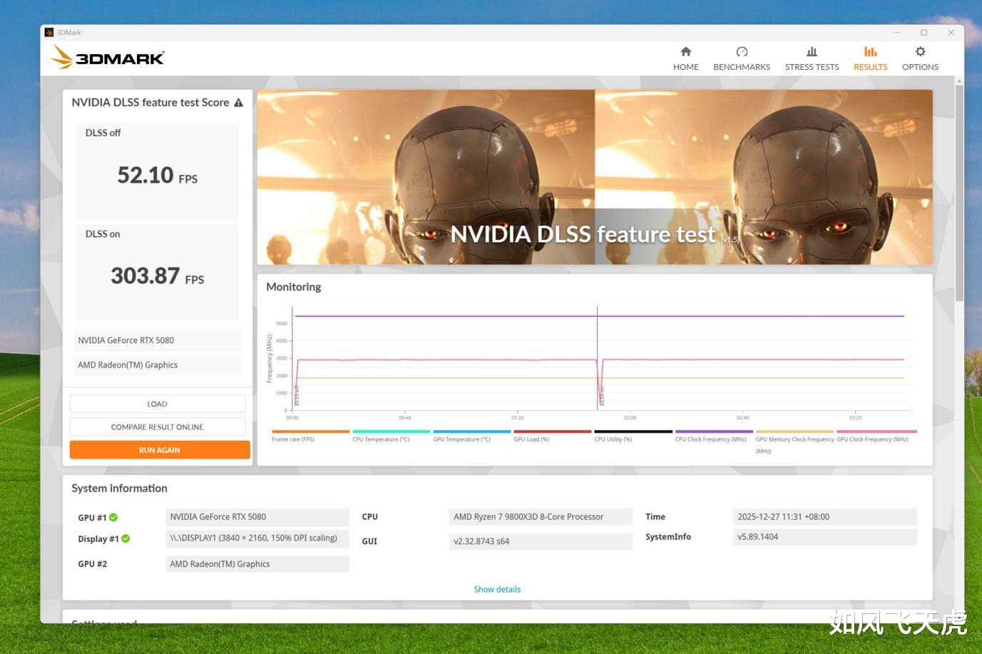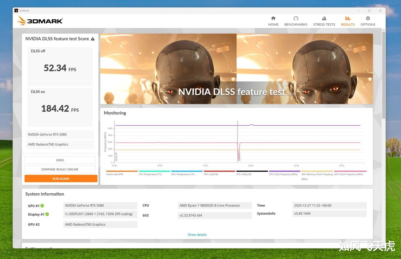 3DMARK NVIDIA DLSS测试,RTX 5080支持DLSS4。2x测试:DLSS关闭时是52.34帧,启用时是184.42帧,提升达3倍多。