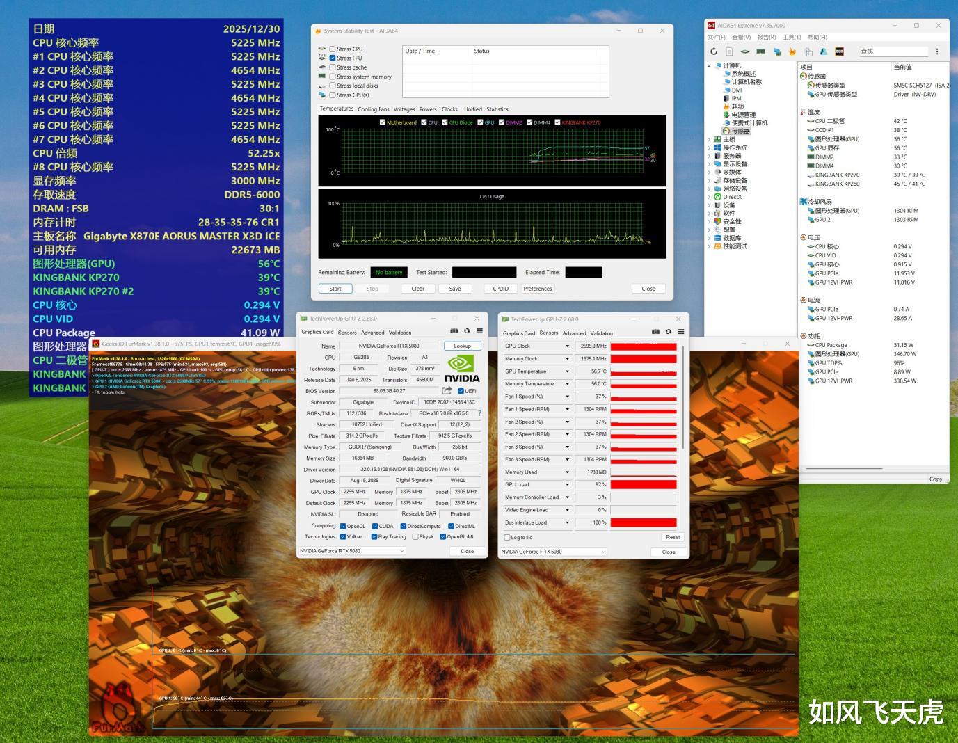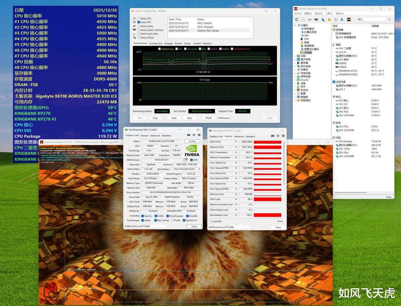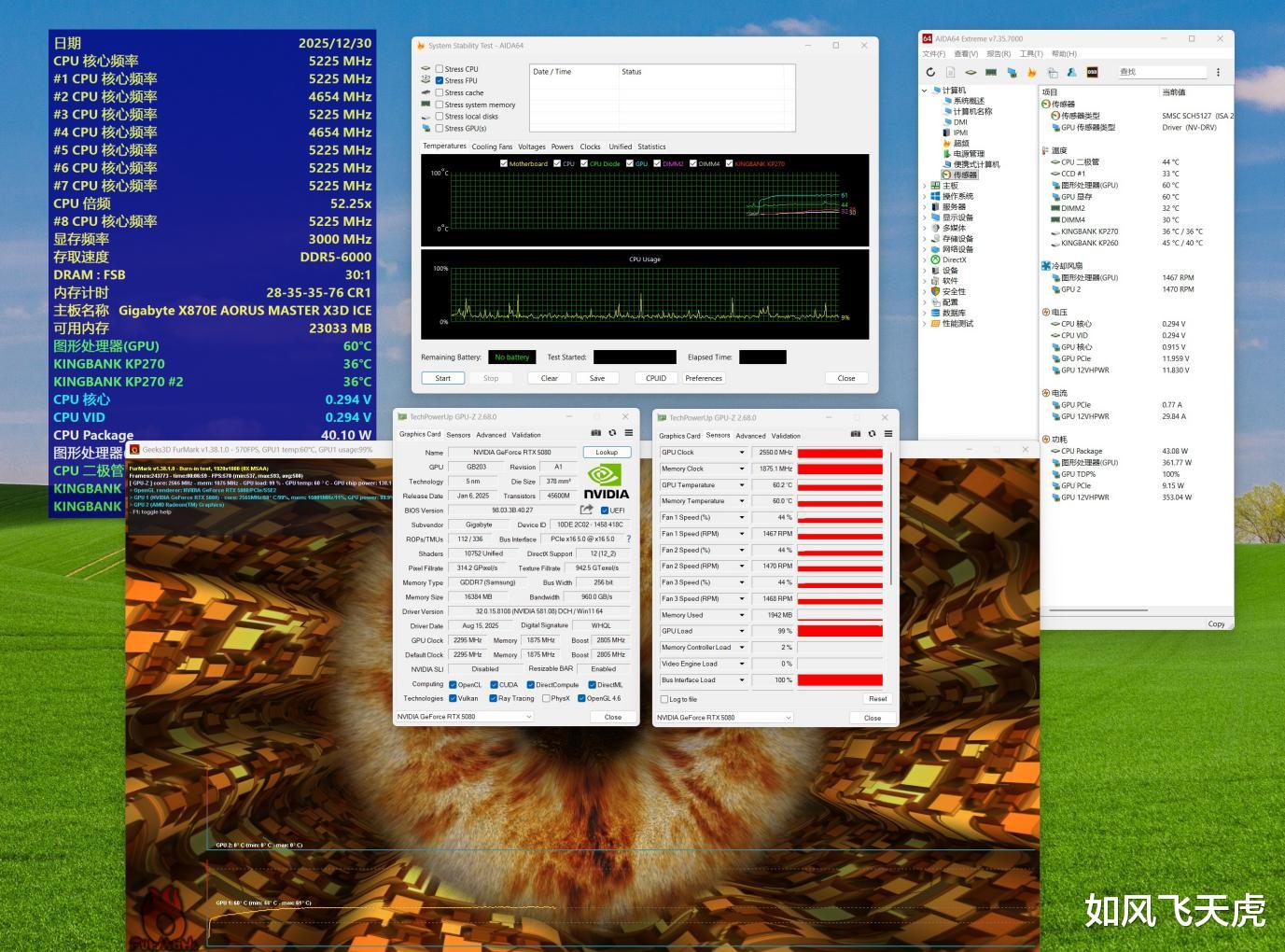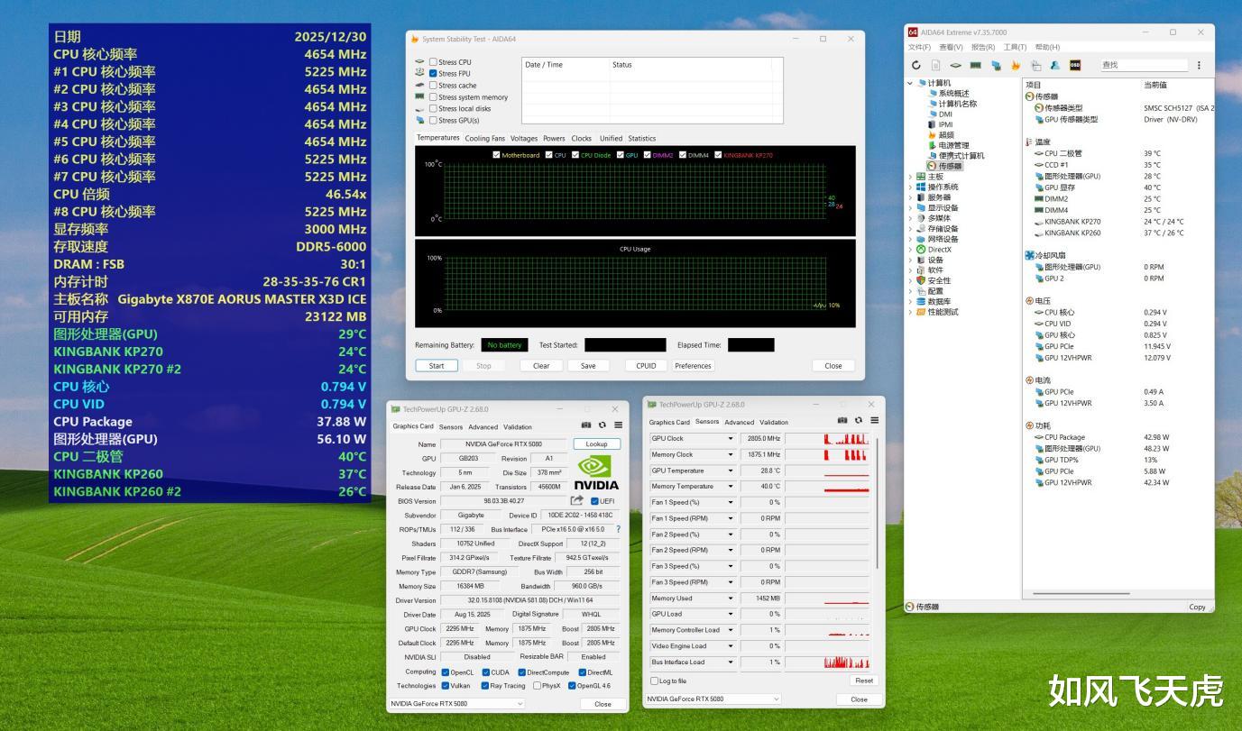 在硬件素质与散热表现上,RTX 5080超级雕ICE凭借5nm工艺、16GB GDDR7显存与高达2805MHz的加速频率,配合技嘉独家冰雕散热设计,即使在双烤压力下,GPU核心温度也仅维持在60°C左右,堪称“冷静输出”。X870E AORUS MASTER X3D ICE超级冰雕主板则以纯白冰纹设计与18+2+2相全数字供电系统诠释高端,搭配Epic VRM散热器与磁吸M.2装甲,不仅颜值出众,更在超频与稳定性上表现卓越,为整机提供坚实后盾。