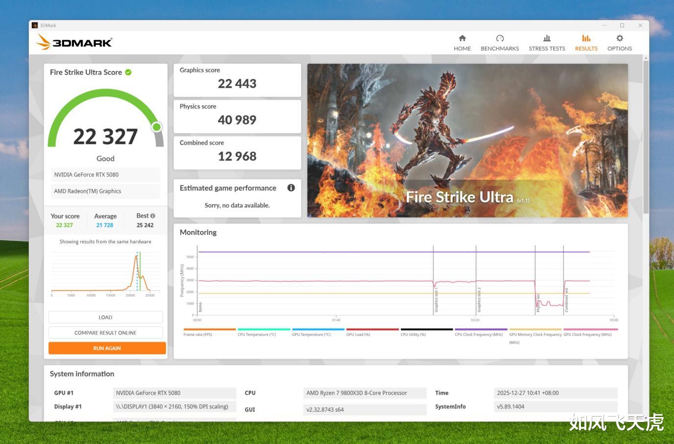 3DMARK Fire Strike Ultra测试,总分22327,其中图形得分22433,物理得分40989,综合得分12968。3DMark Fire Strike 是一款基于DirectX 11图形API的显卡性能基准测试程序,专为评估高端游戏平台的图形处理能力而设计。Fire Strike通过三个不同分辨率的子测试(包括Fire Strike、Fire Strike Extreme和Fire Strike Ultra)覆盖从1080p到4K的多种游戏环境。