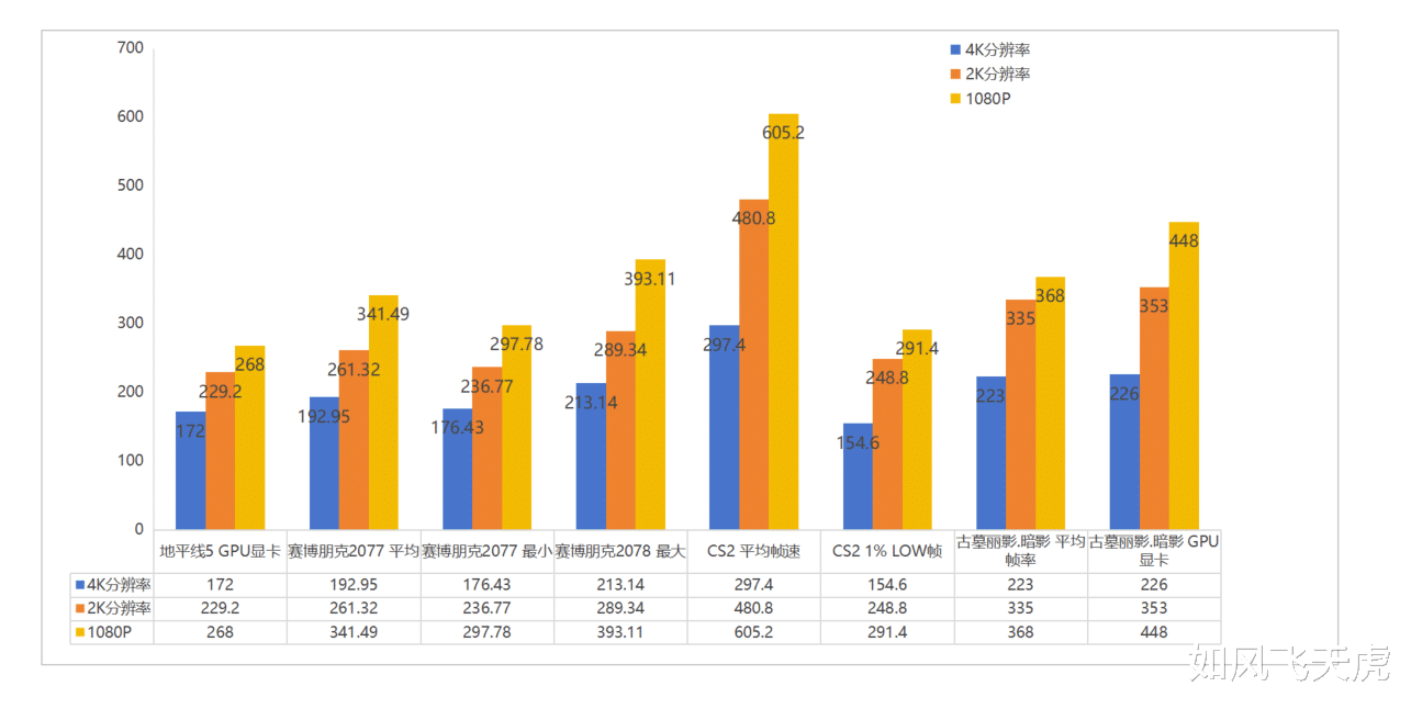 反恐精英CS2,在4K分辨率高画质下,平均297.4帧,1%low帧是154.6。2K 高画质下,平均帧率是480.8,1%low帧是248.8帧。切换到1080P高画质下,平均帧率是605.2,1%low帧是291.4帧。